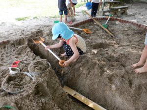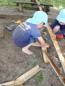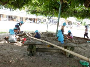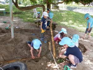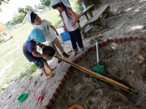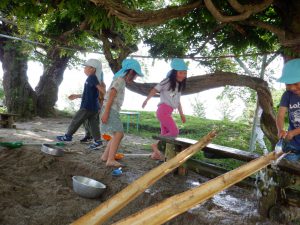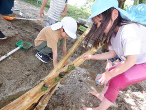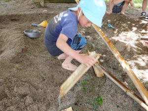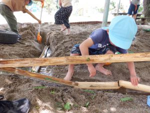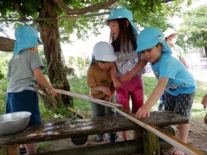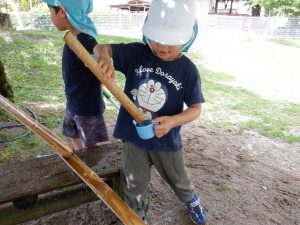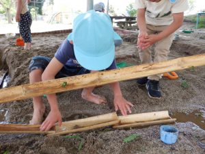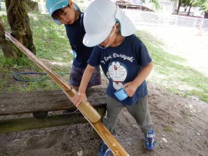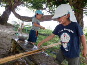 竹の樋を使って、繋げたり、水を流したり、草で流しそうめんをしたり、水で濡れた体に太陽の温かさも感じられたり、みんなでたくさんの工夫と発見をして楽しく遊ぶことができました。