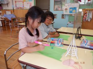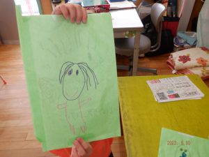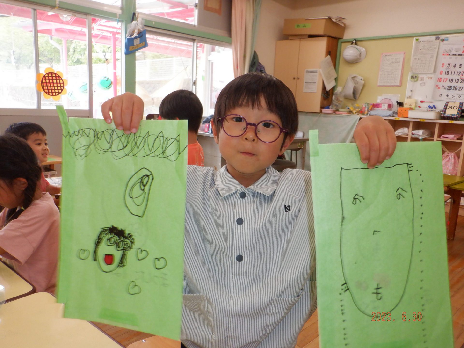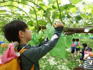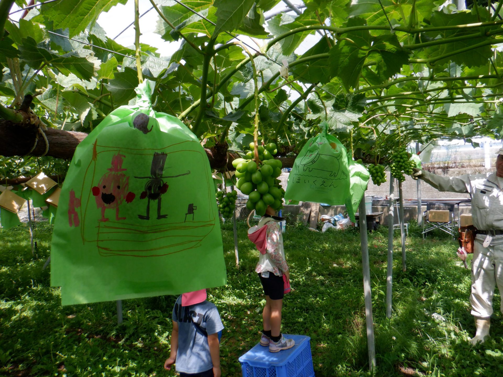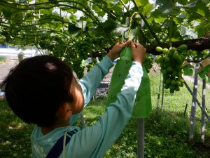 ・袋に自分で絵を描いたことで、「自分のぶどう。」と愛着が持てたようです。時々ぶどうの生長を見に行きながら秋の収穫を楽しみにしたいと思います。