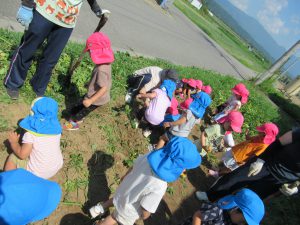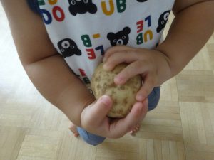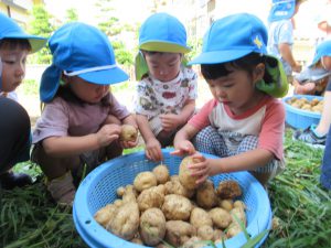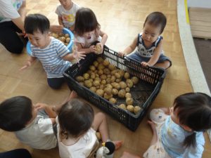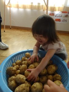 2歳児さんは一生懸命にじゃがいもを見つけ、土にも触れることができました。1歳児さんは言葉がない中でもじゃがいもに触れてみたり、とても興味を持って見ていました。それぞれに感じることがあったのではないかなと思います。この体験を通し、食材に興味を持ち、たくさん食べてくれるといいなと思います。
