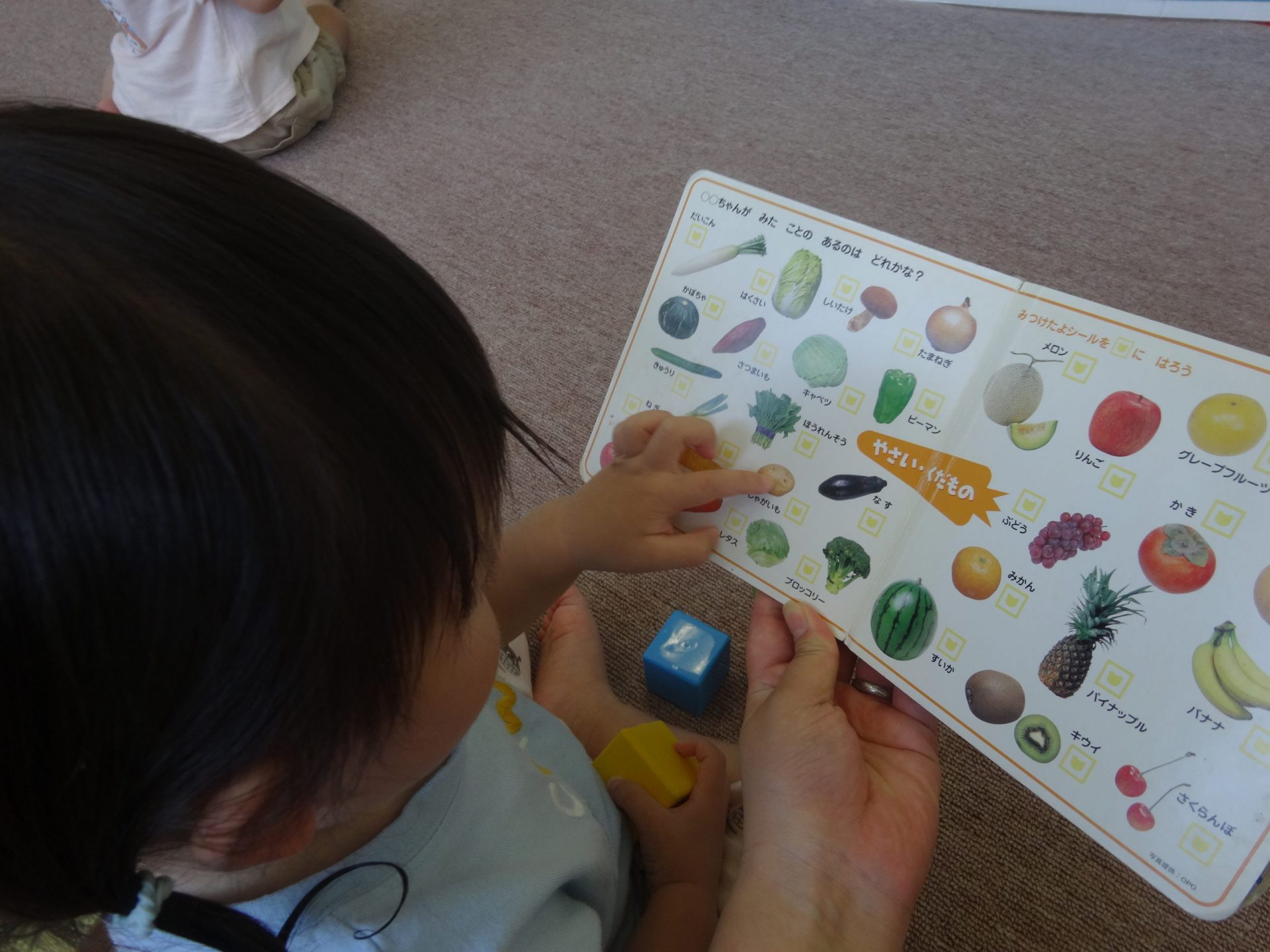 じゃがいもを見せてもらったあとにクラスで絵本を読んでいると、その中でじゃがいもを見つけ指差しをしていました。