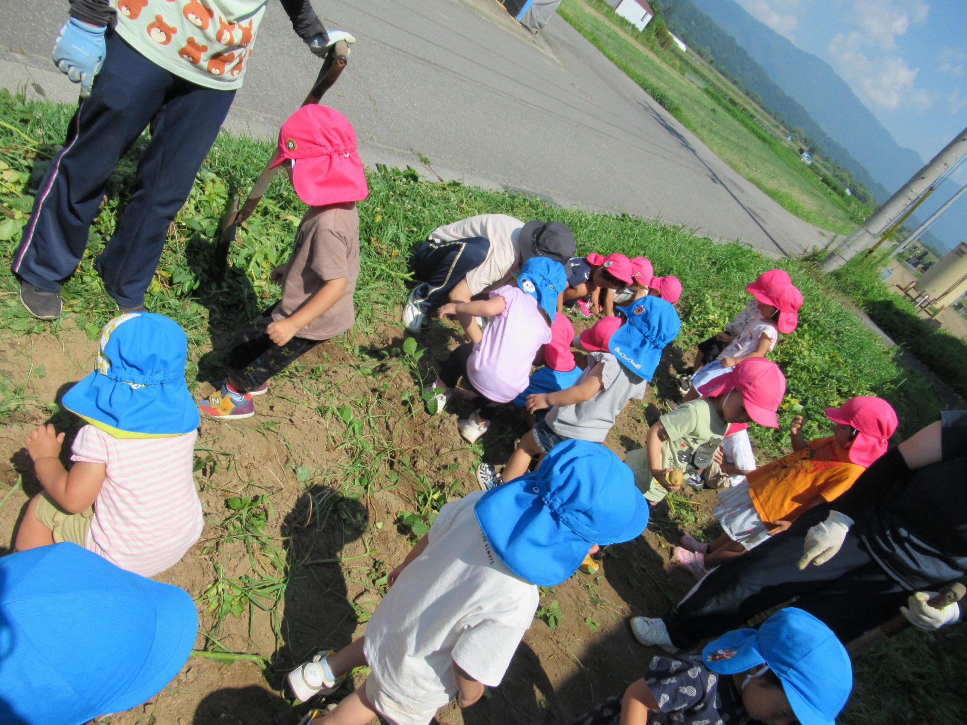 雪組さん3歳児のお兄さんお姉さんと一緒に畑のじゃがいも掘りをしました