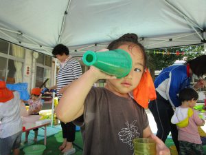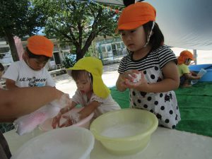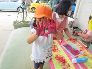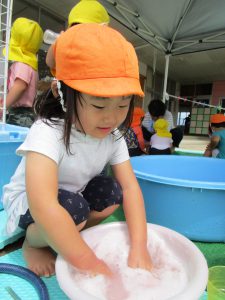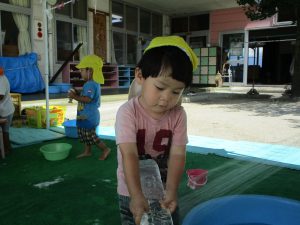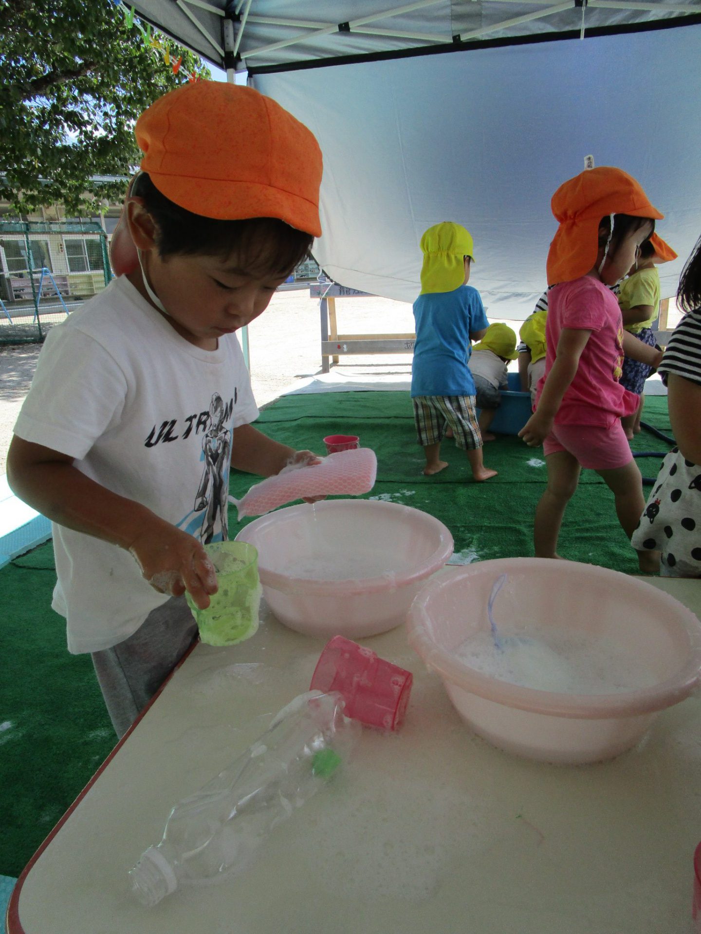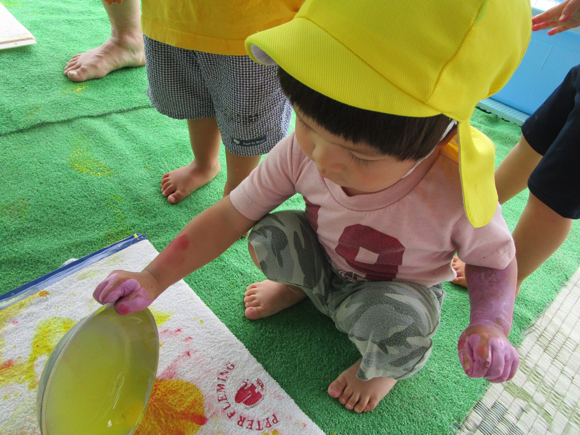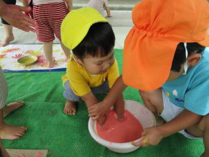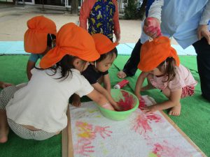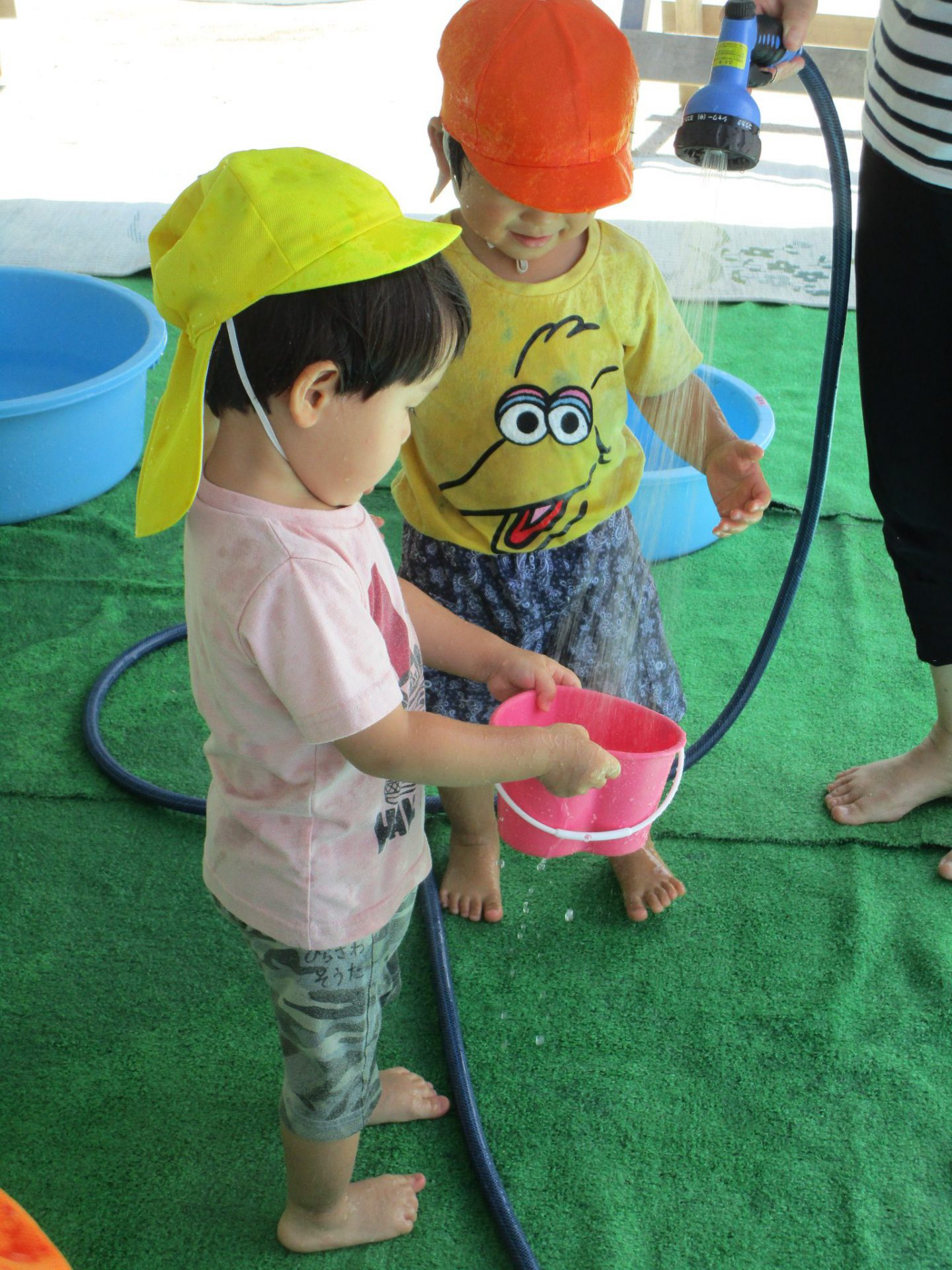 毎日暑い日が続く中で未満児さんも水に慣れ、いろいろなおもちゃを出してみたり、石鹸で泡を作ってみたり、色水で手形を取ってみたりして水遊びを楽しんでいます。色水など始めは抵抗のある子も2歳児が1歳児を誘ったり、友だちの様子を見て真似たりして、抵抗なく自然に遊びに関わり楽しむ姿があり、無理に誘ったりすることなく、子どもたちが楽しめる環境の工夫をこれからもしていきたいと思います。