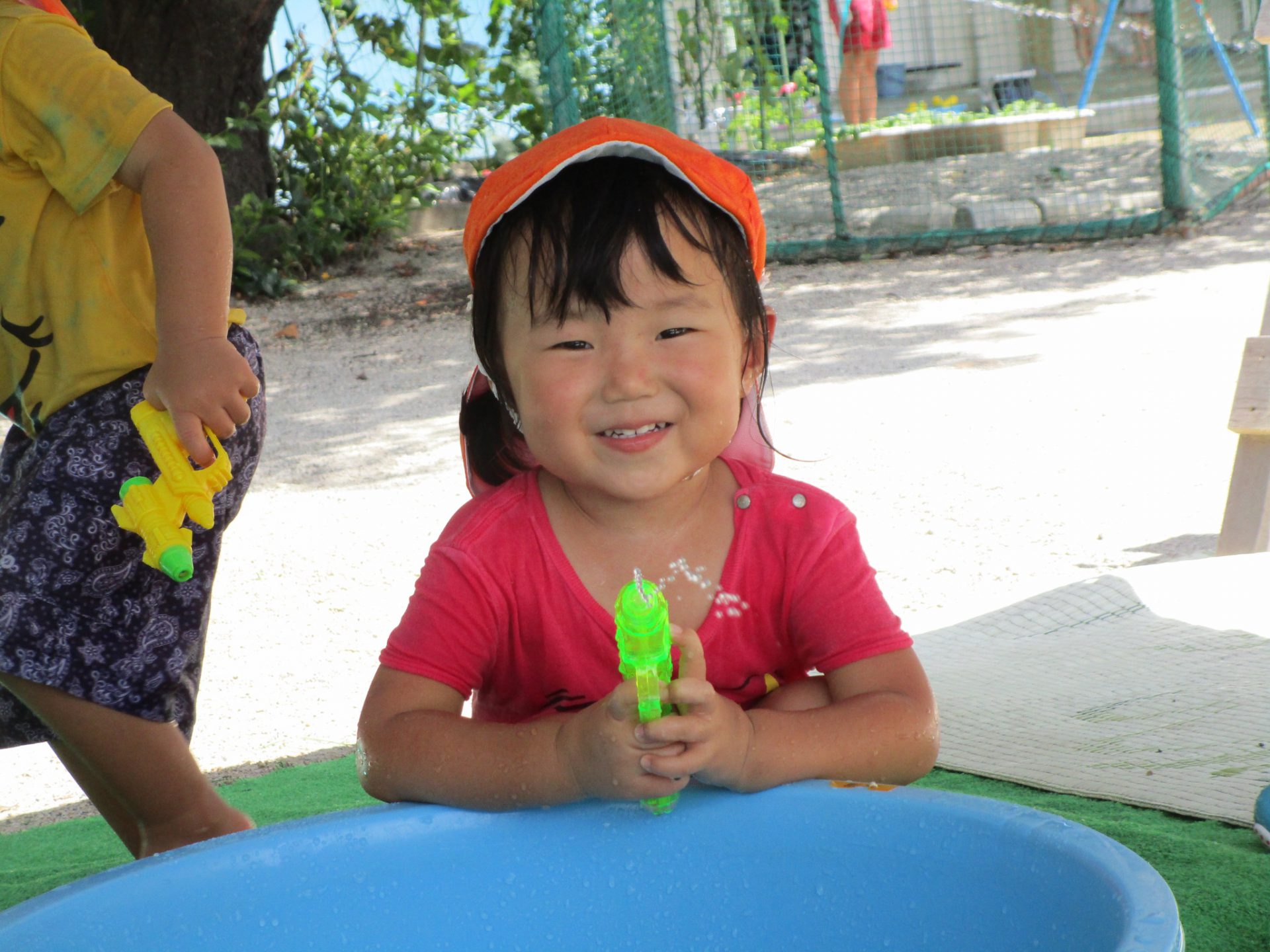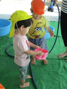 暑い日、今日もテラスや園庭のテントのしたで1・2歳の未満児さんが水遊びを始めます。