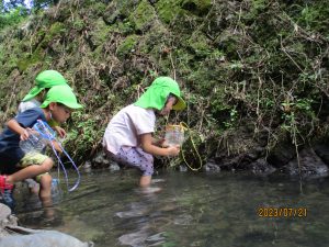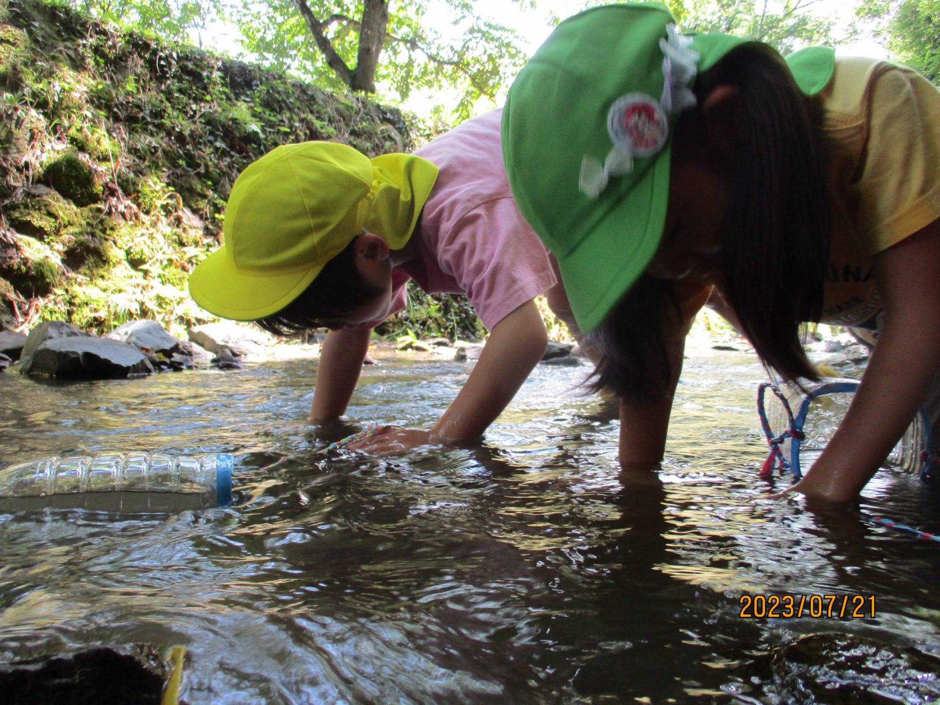 それぞれにカニ・エビ・魚を追いかけて、「どうやったら捕まえられるかなあ」と考えながら遊ぶ姿が見られました。保育士が声を掛けなくても自然と忍び足をしていました。