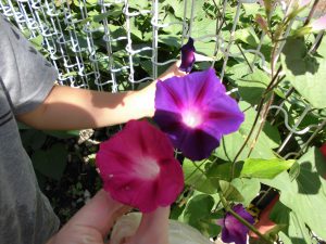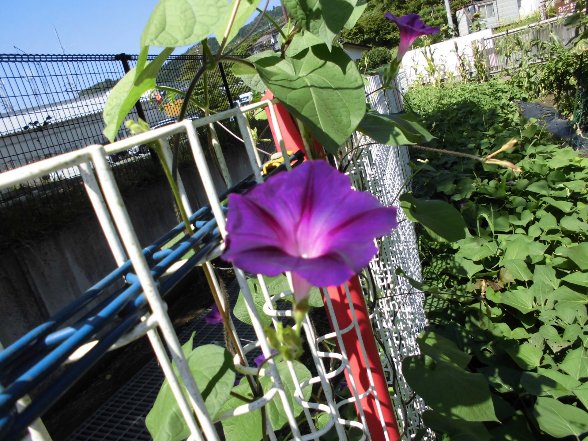 畑の水やりをしていると…フェンスに咲いていたアサガオを発見🔍