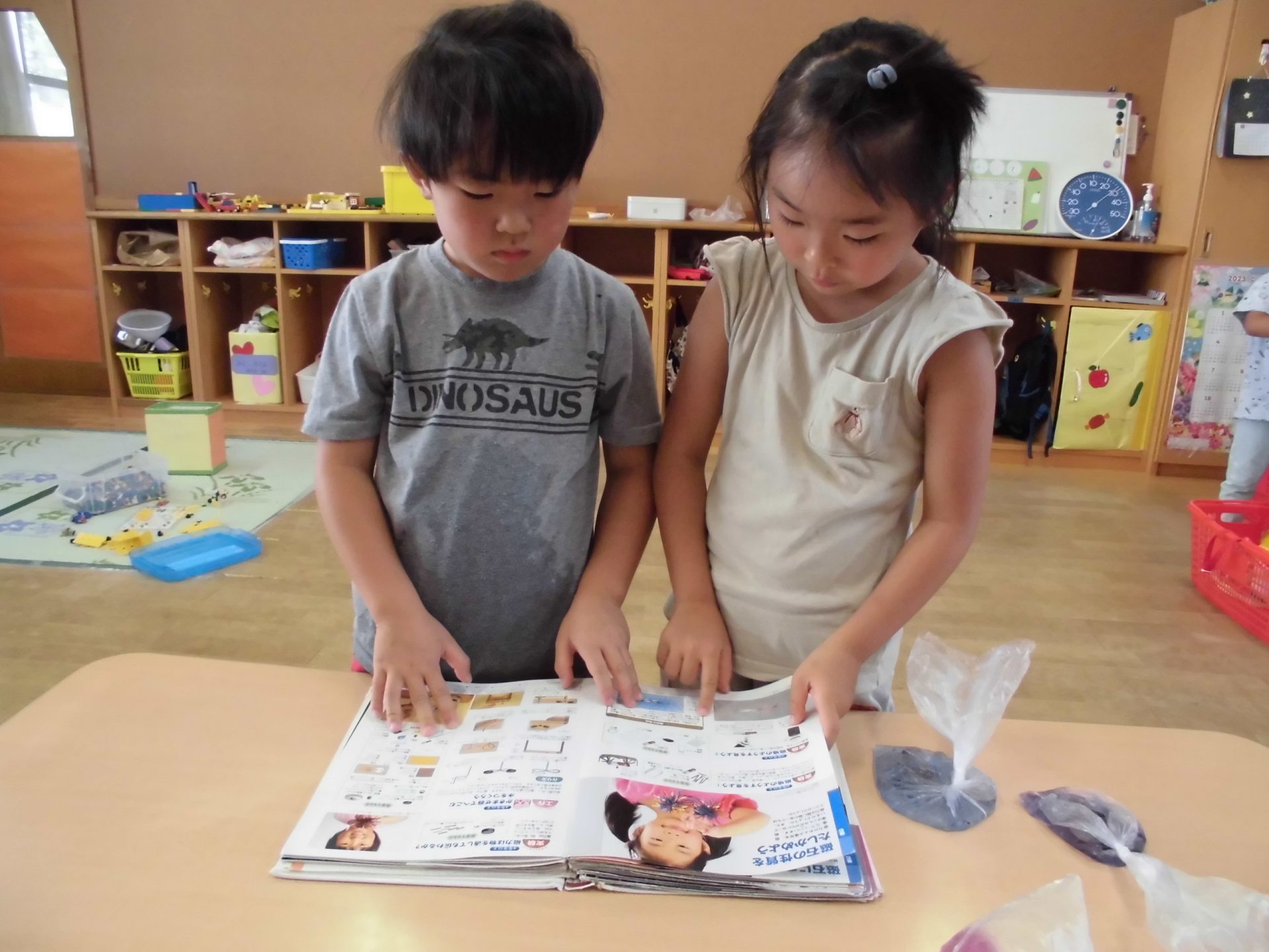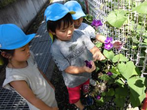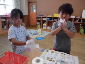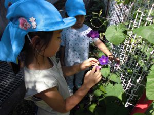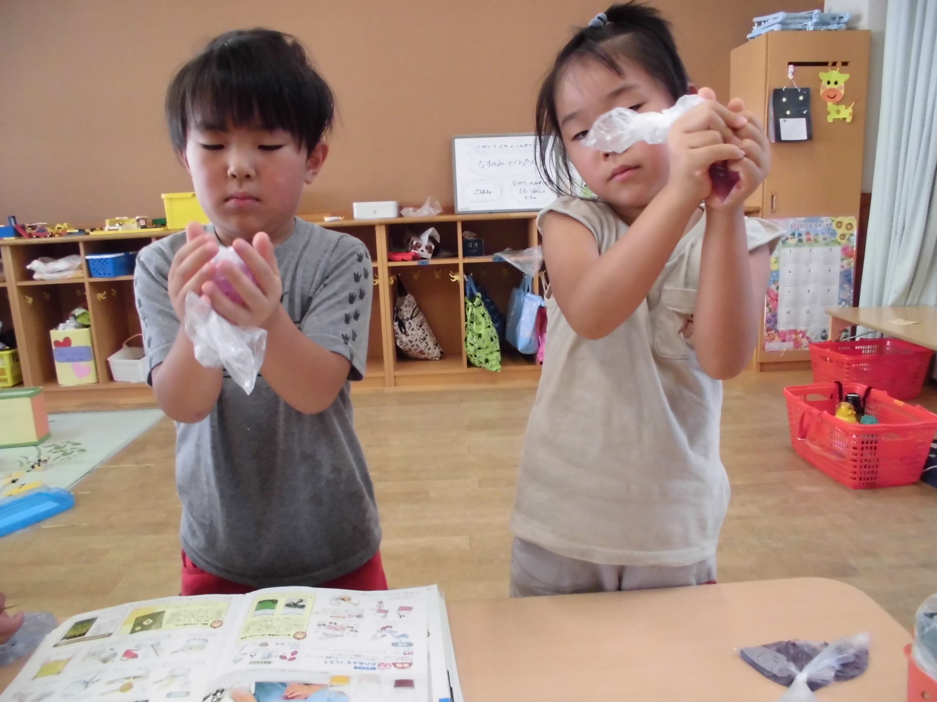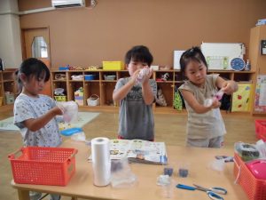 昨年度、色水で遊んだことを思い出し「これで色水やろう!!」と色水作りが始まりました。