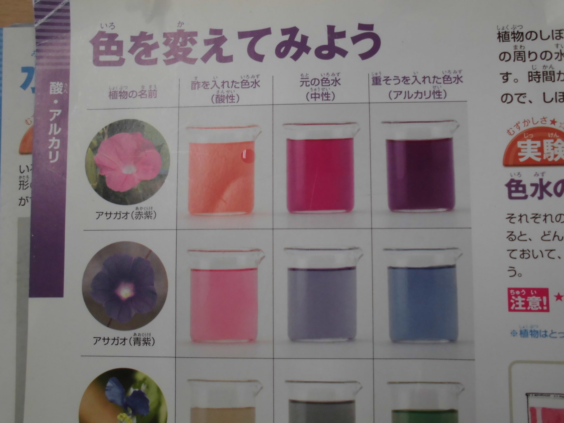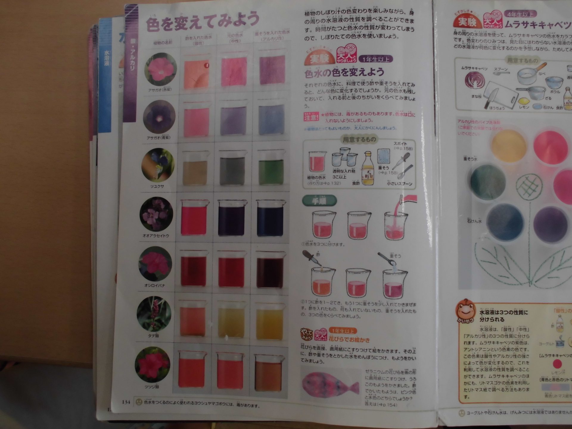 部屋に戻り、科学実験の図鑑を開いて”花の色水実験”のページを探すと…