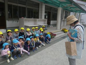 「いつも遊んでいるお山で宝探しをしよう!!」保育士の話をワクワクしながら聞いています。山の約束を確認し、年中・年長さんでペアになって出発です。
