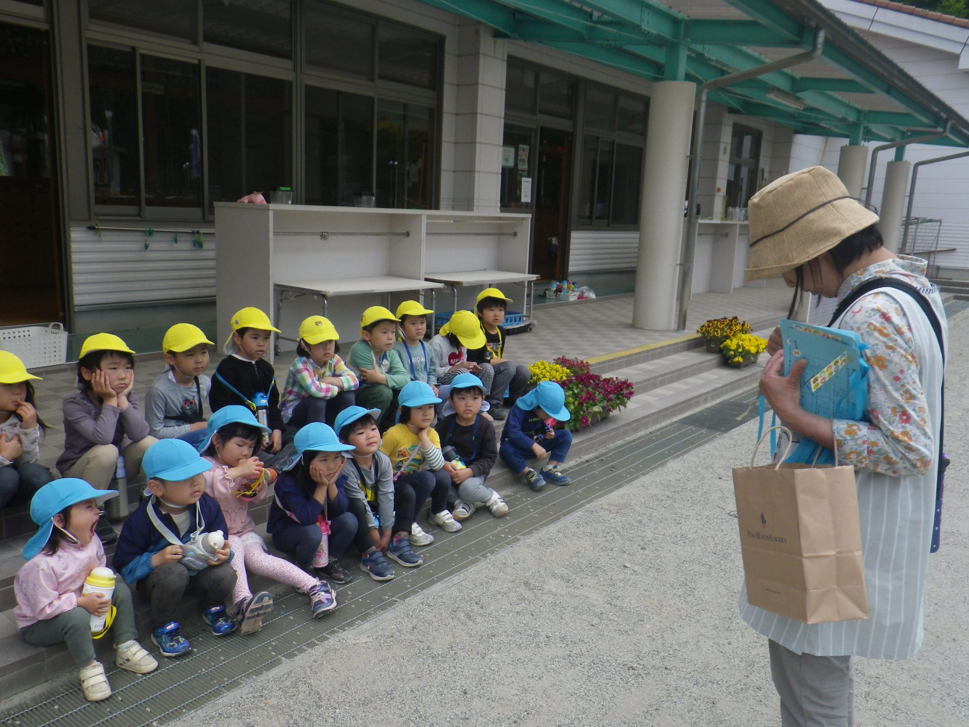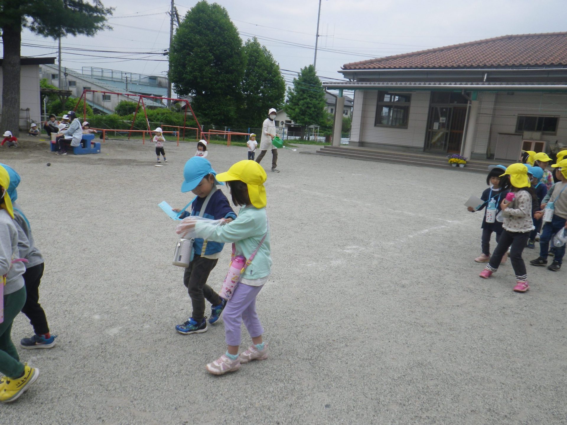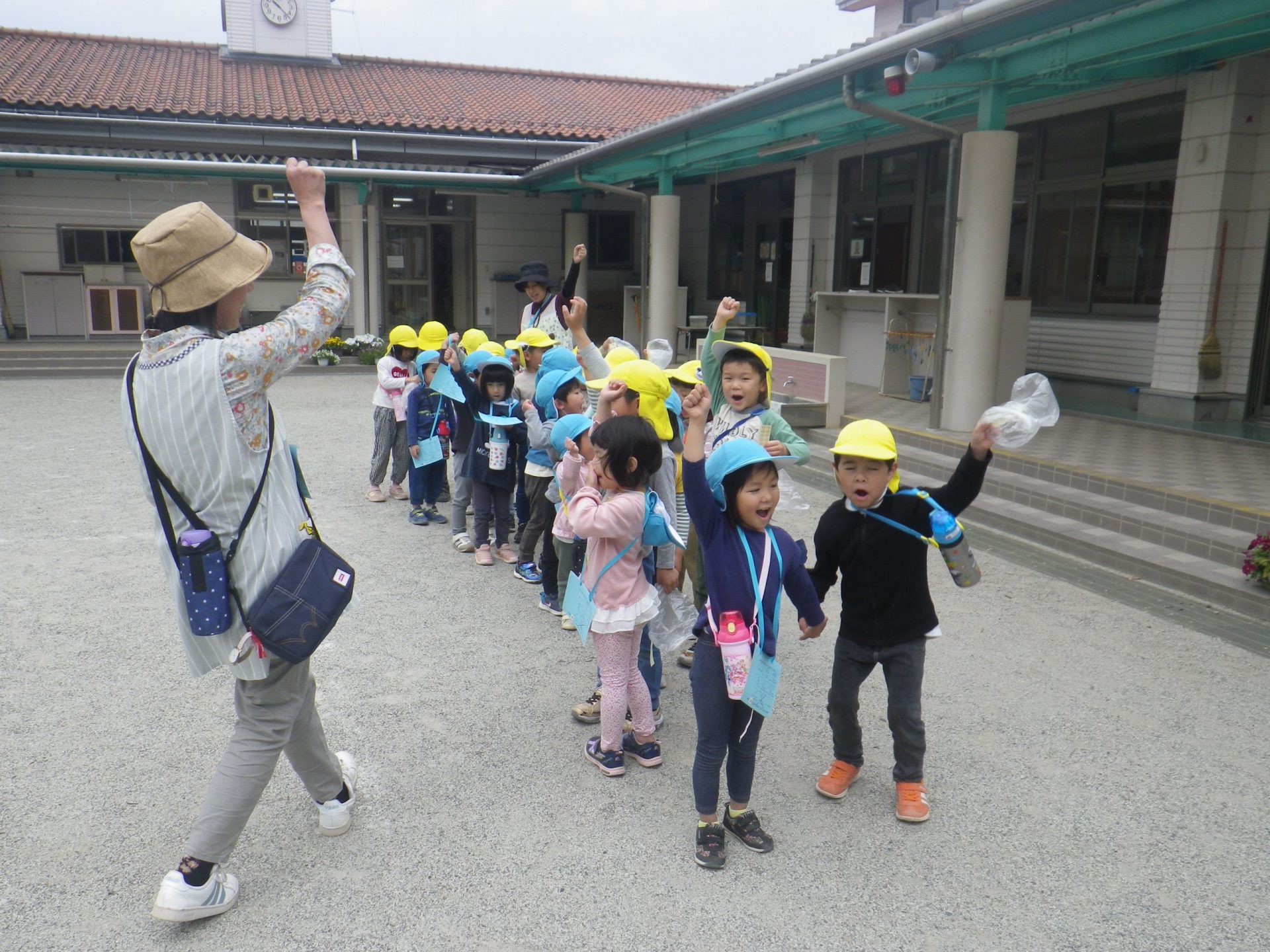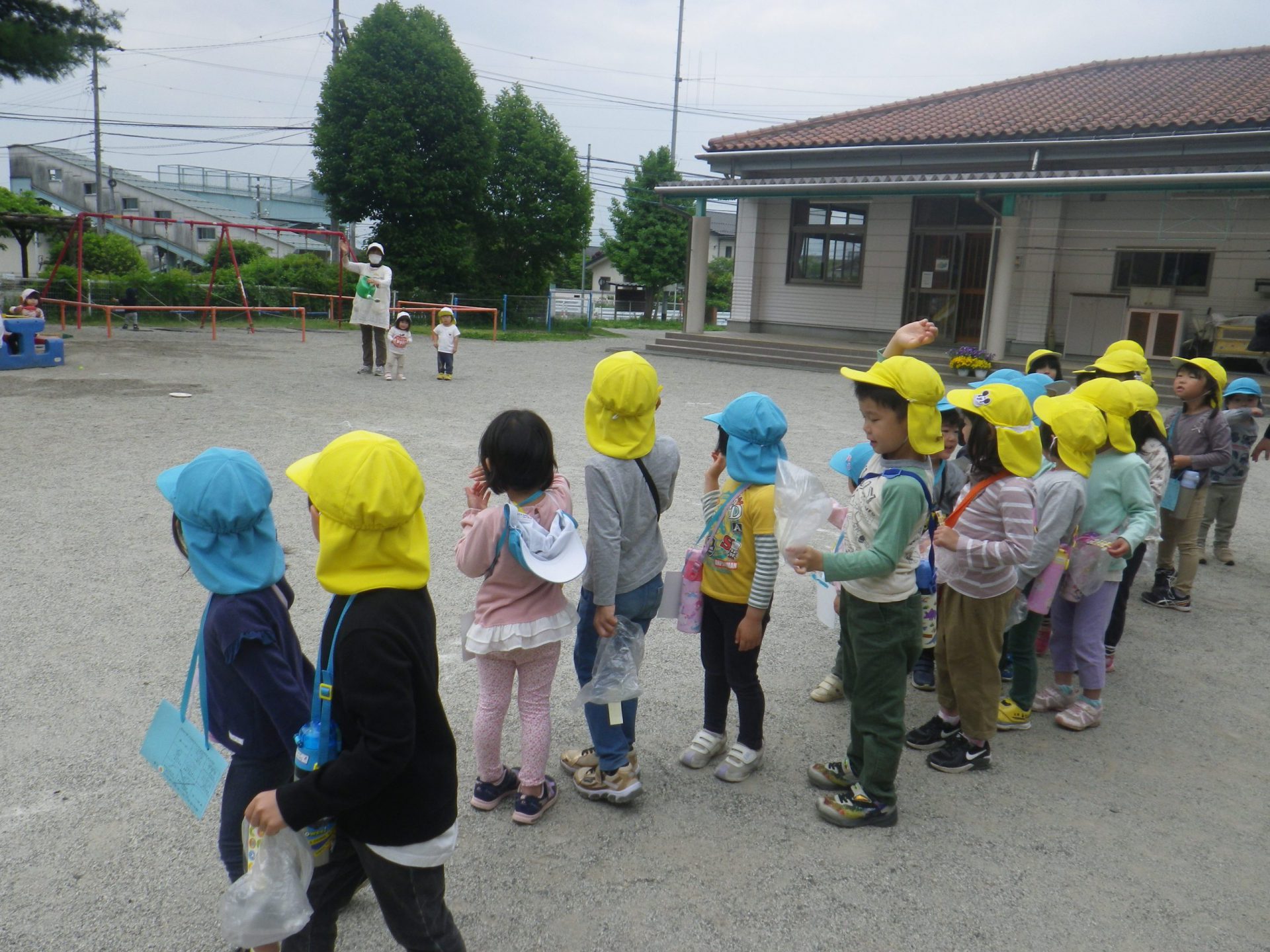 園庭で遊んでいる小さい組さんに 「行ってきまーす!」