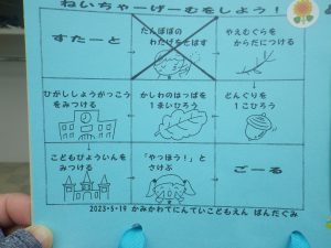 「水筒あるよ」「虫に刺されないように長袖・長ズボンOK!!」「今日のミッション楽しそう♪」
