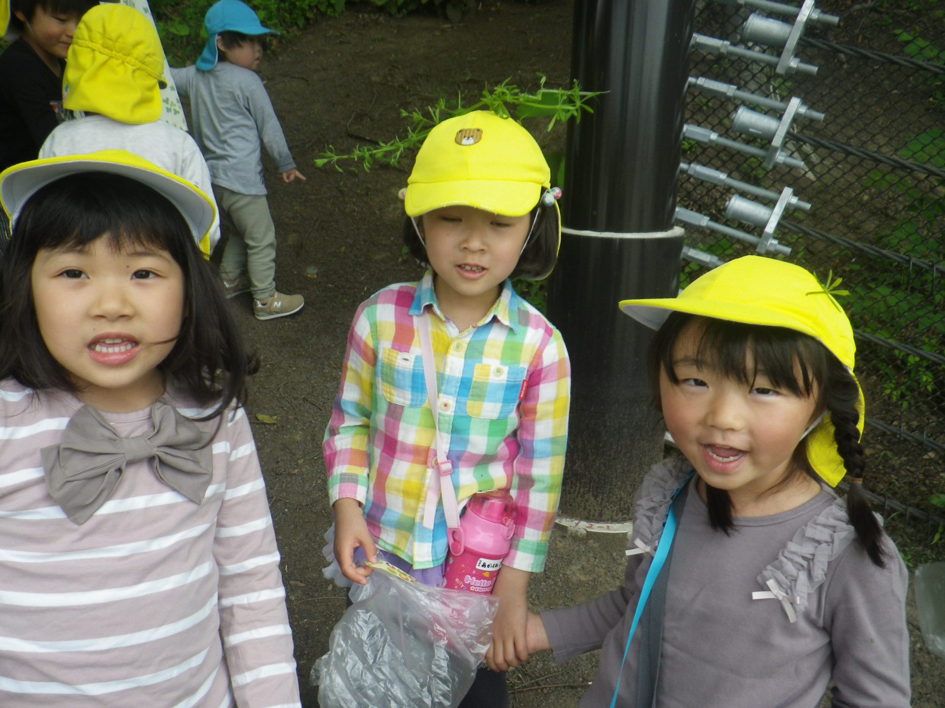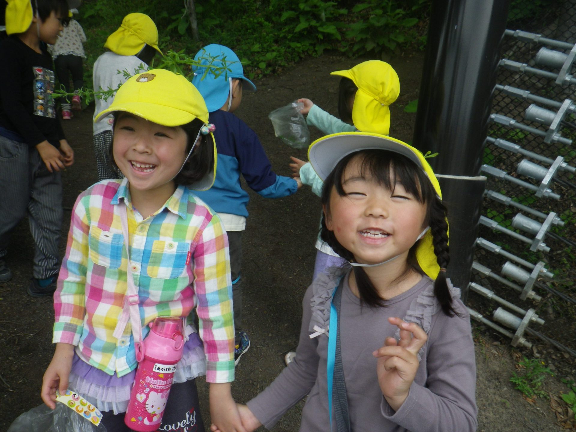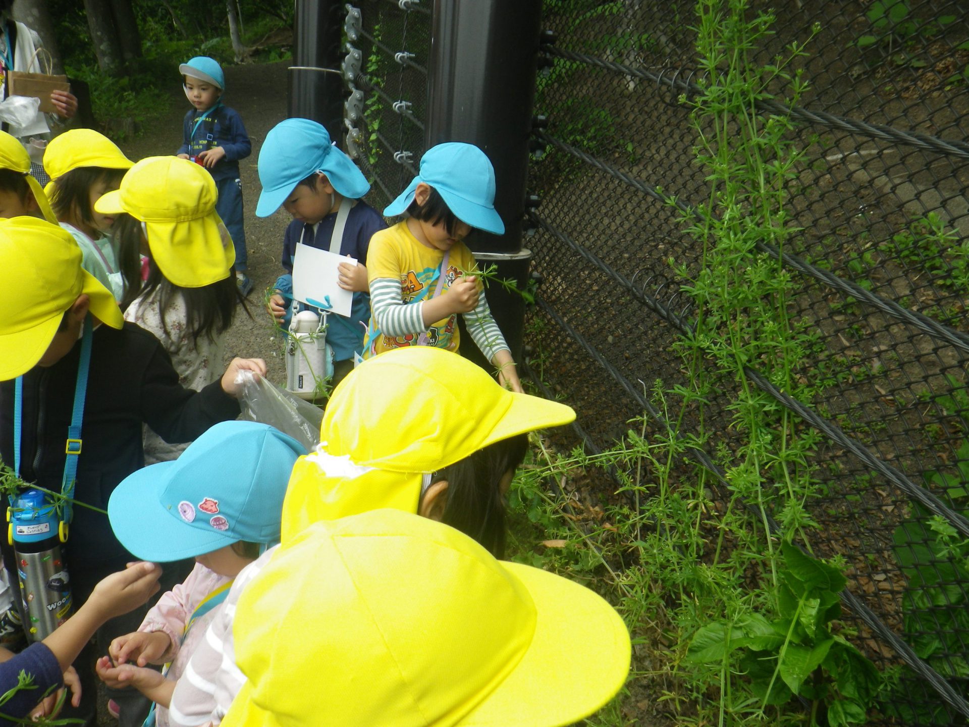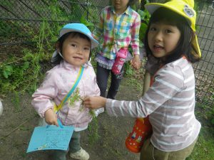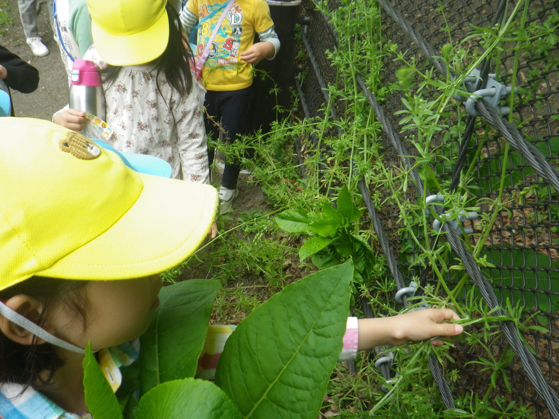 「あっ、ヤエムグラ見っけ!」年長児が年中児に「これだよ。身体につけてごらん。」と優しく教えてくれました。