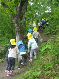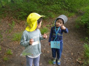 ネイチャーゲームを通して、普段から遊び慣れている山にどんな草花があるか、どんな遊び方があるかに気付いて新たな発見ができ、自然物に触れて楽しんで、より山に親しみ遊びを楽しむ姿が見られました。