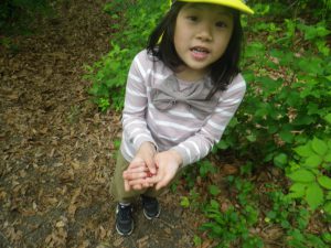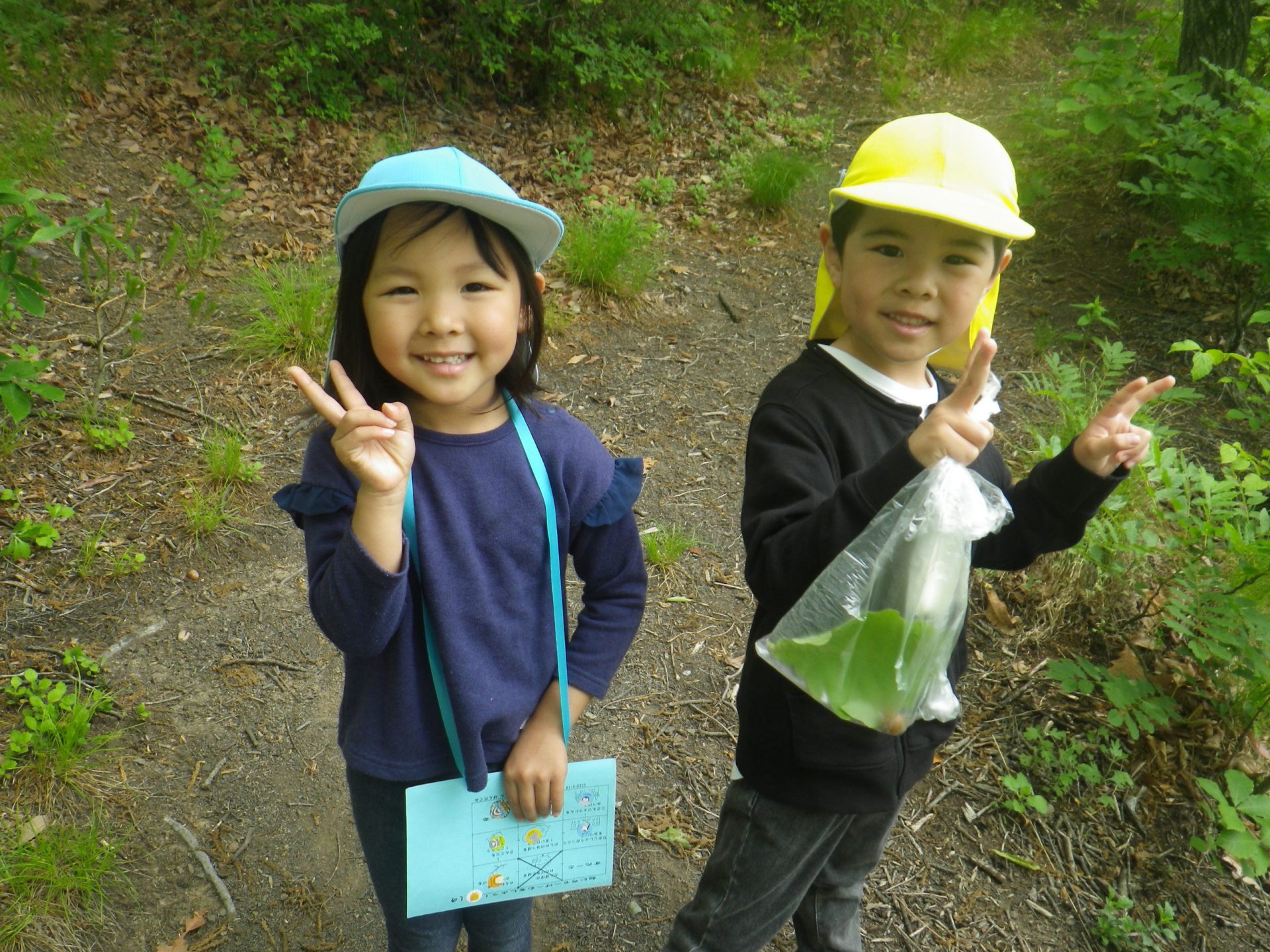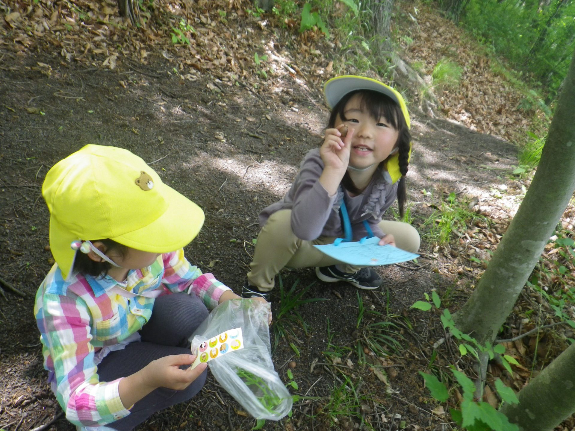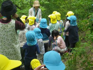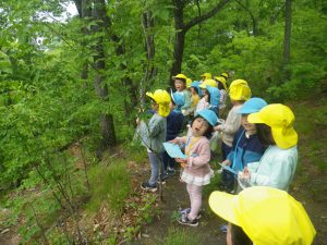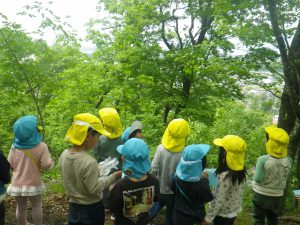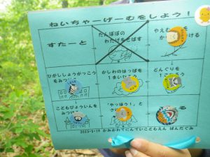 いつも楽しんでいる裏山での山遊び。今日は年中・年長児でネイチャーゲームを楽しみます。