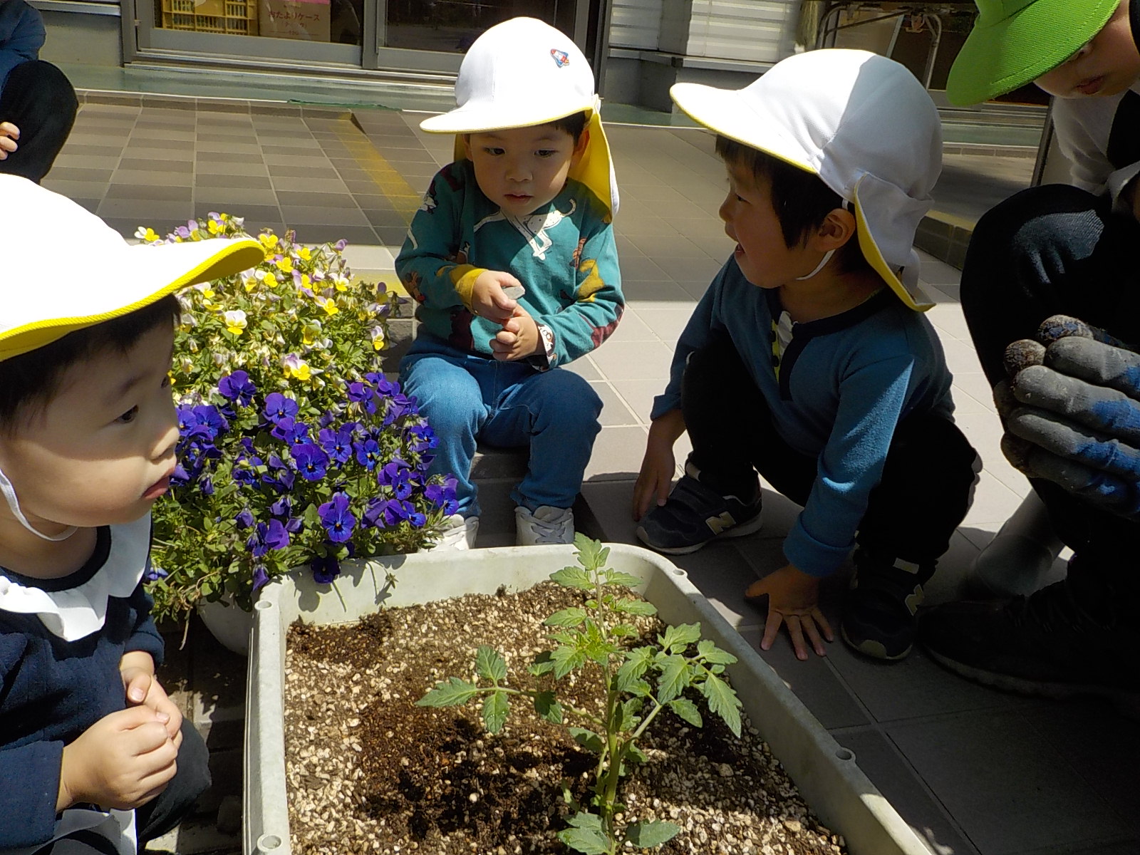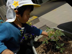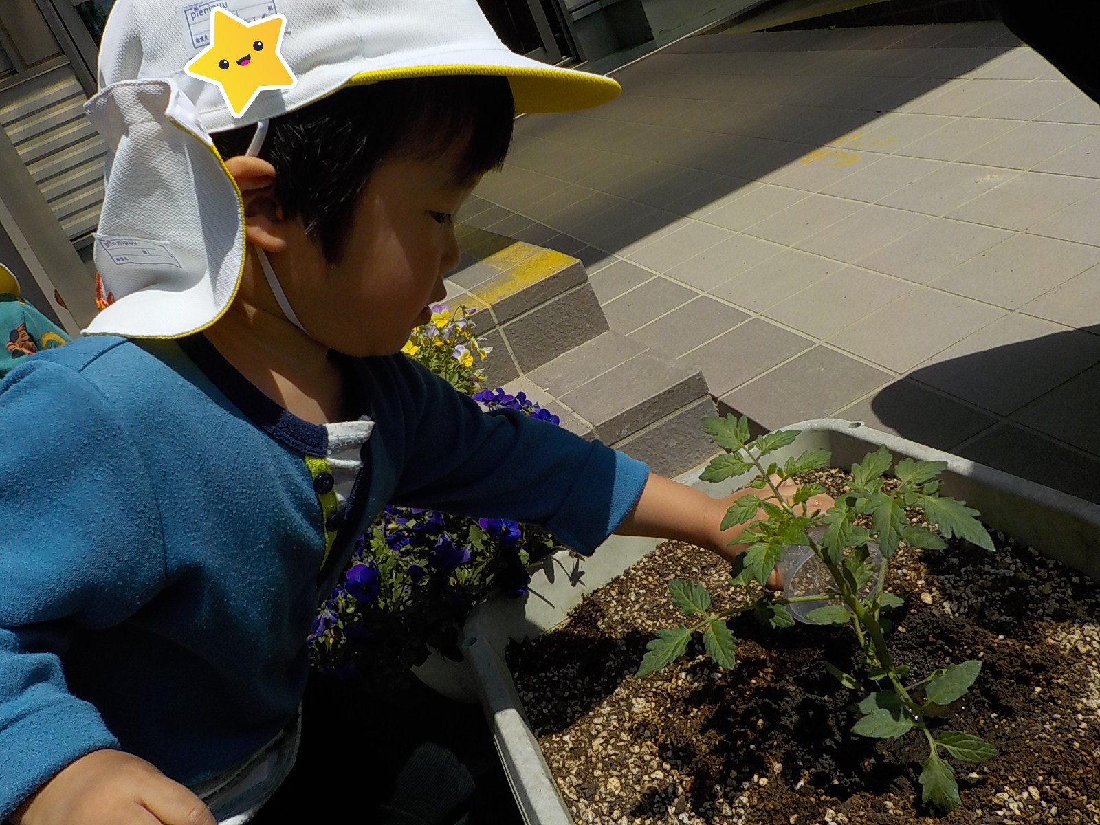 「これはなんだろう・・・?」と不思議そうな子ども達でしたが、「ミニトマトができるんだよ。」と伝えると、じーっと葉っぱを見つめていました。