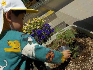 カップ一杯の水を一人ずつあげ、「大きくなーれ!!」とお願いしました。