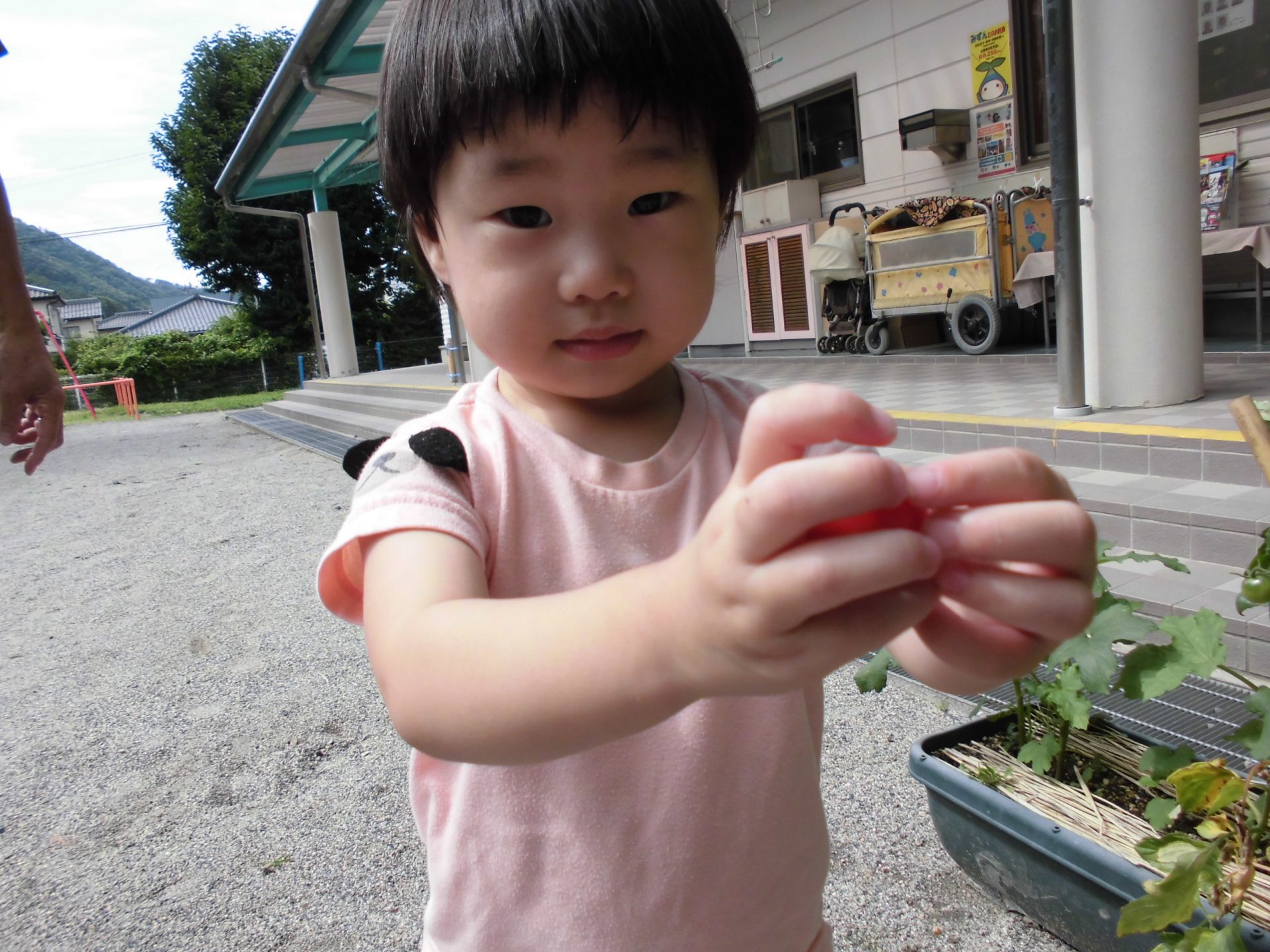 「赤くなるまで見るだけよー。」と保育士の言葉をよく聞いて、「まだ?」と何度も聞きながら収穫を楽しみに待っていました。