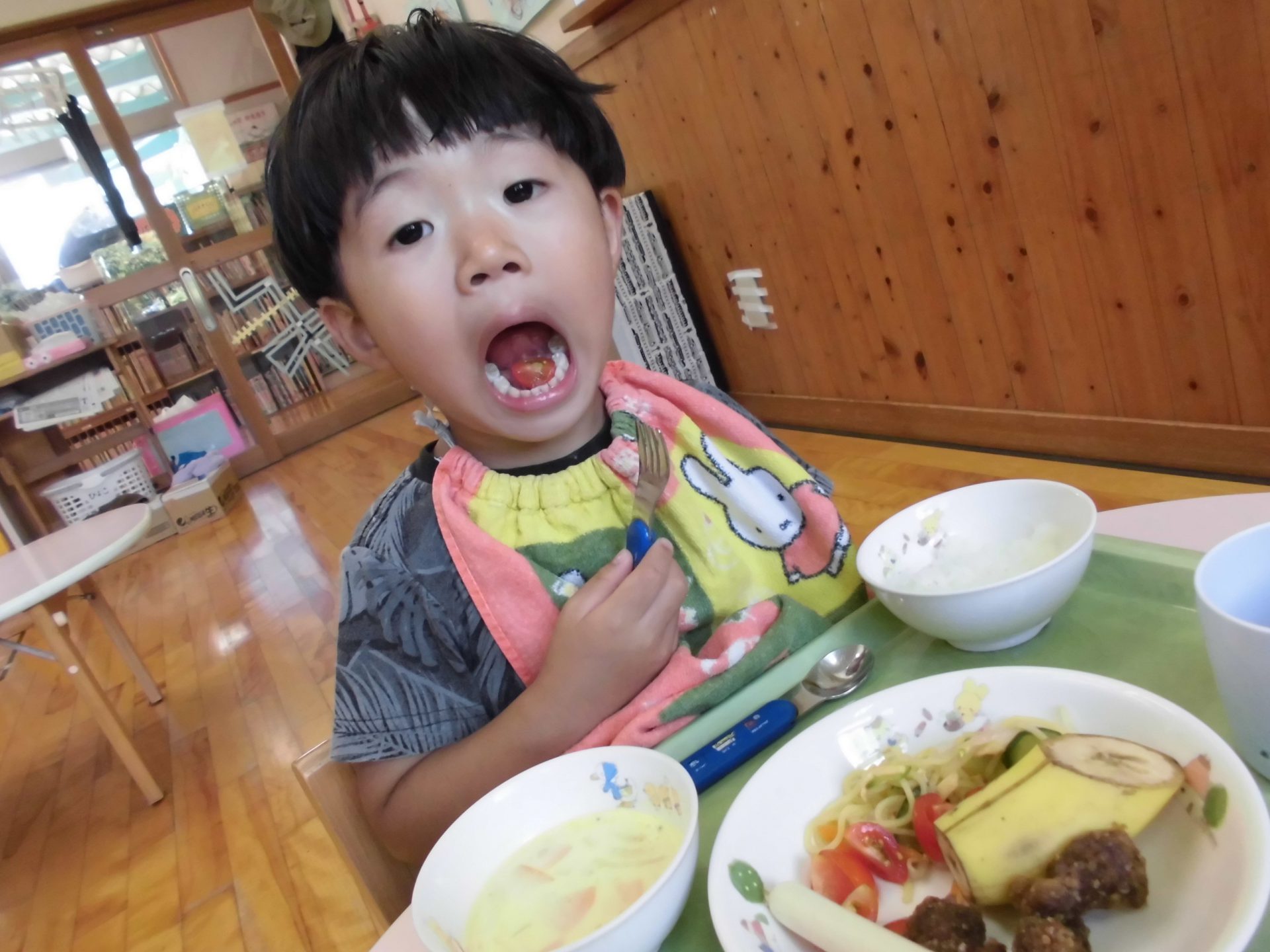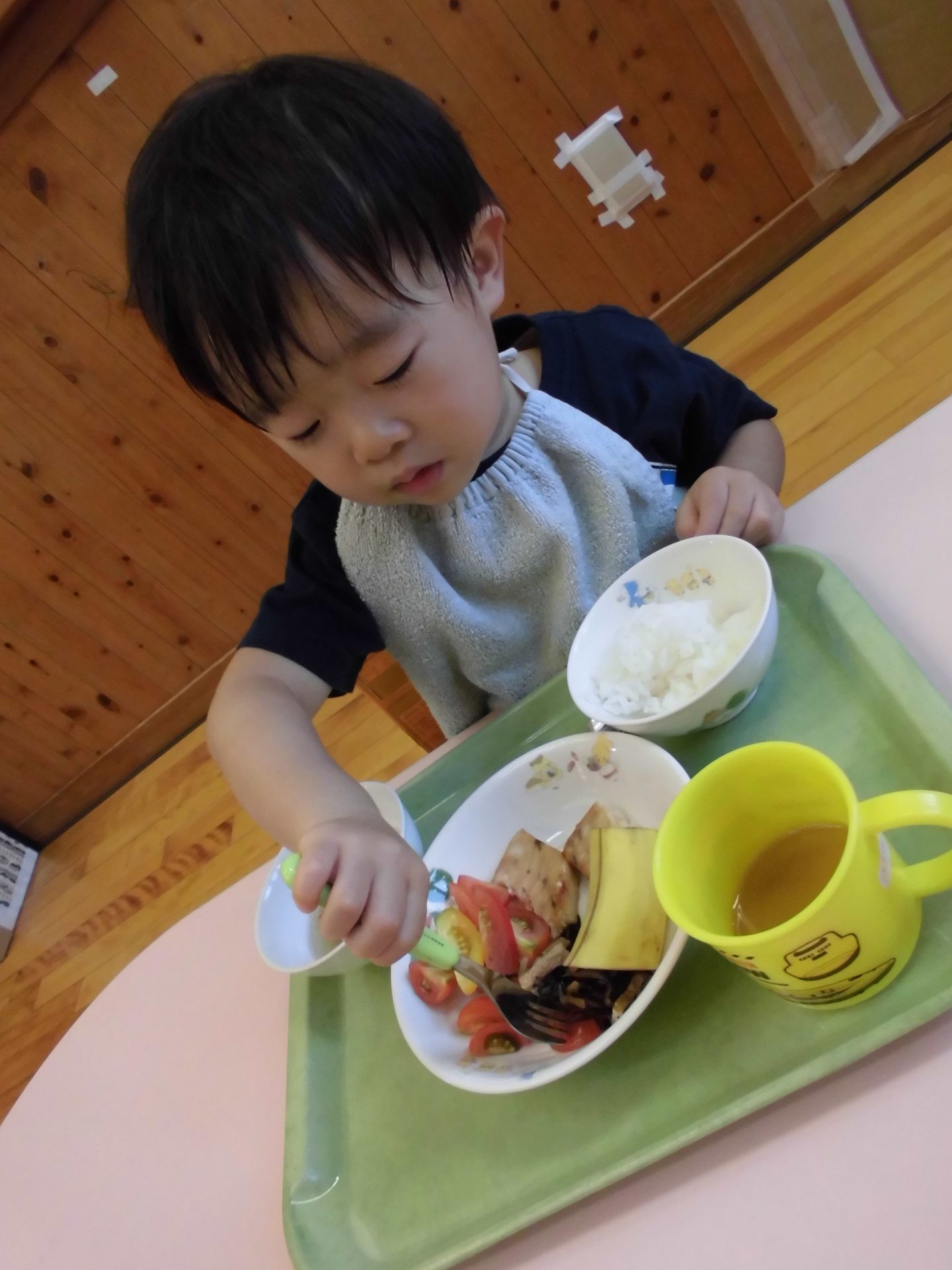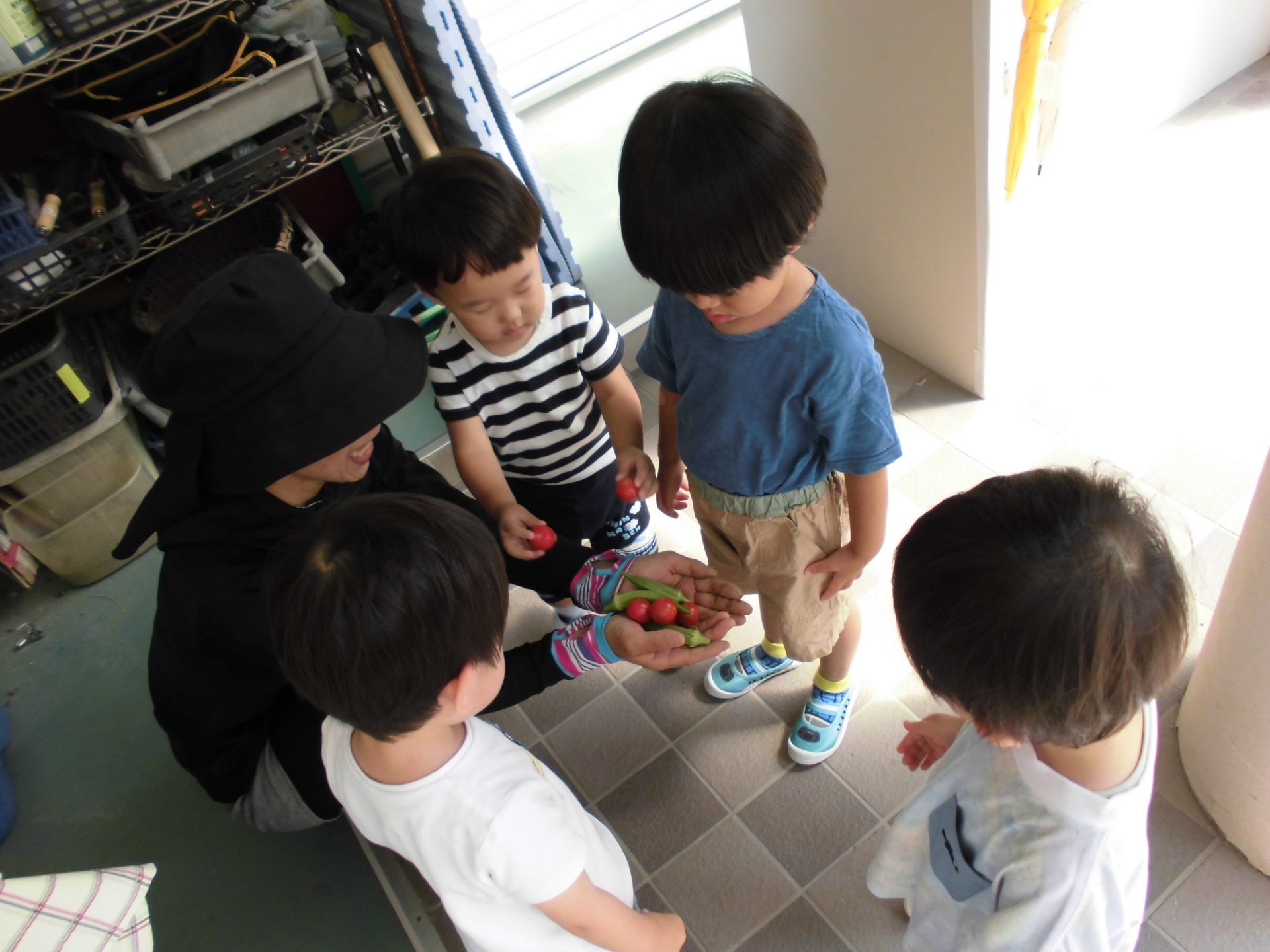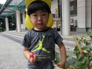 「みんなが採ったミニトマト、美味しいかなあ?」と聞いてみると、パクっと食べて「〇〇(自分)が採ったの、おいし〜」と笑顔が見られました。
