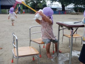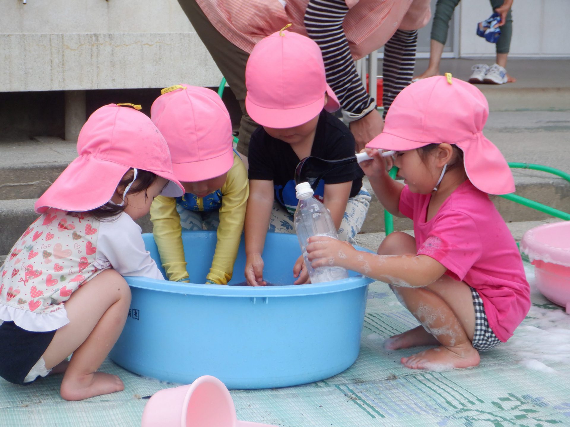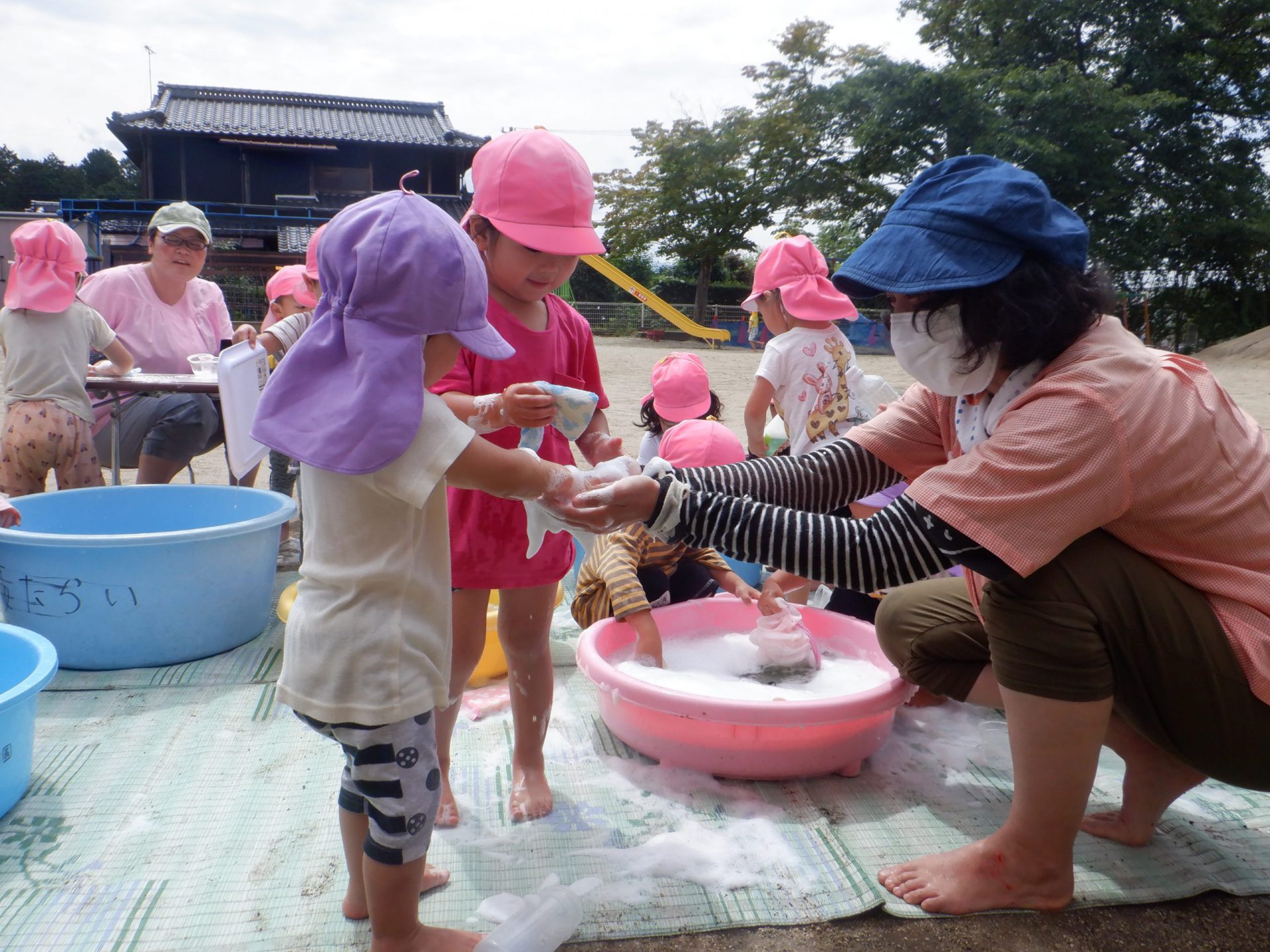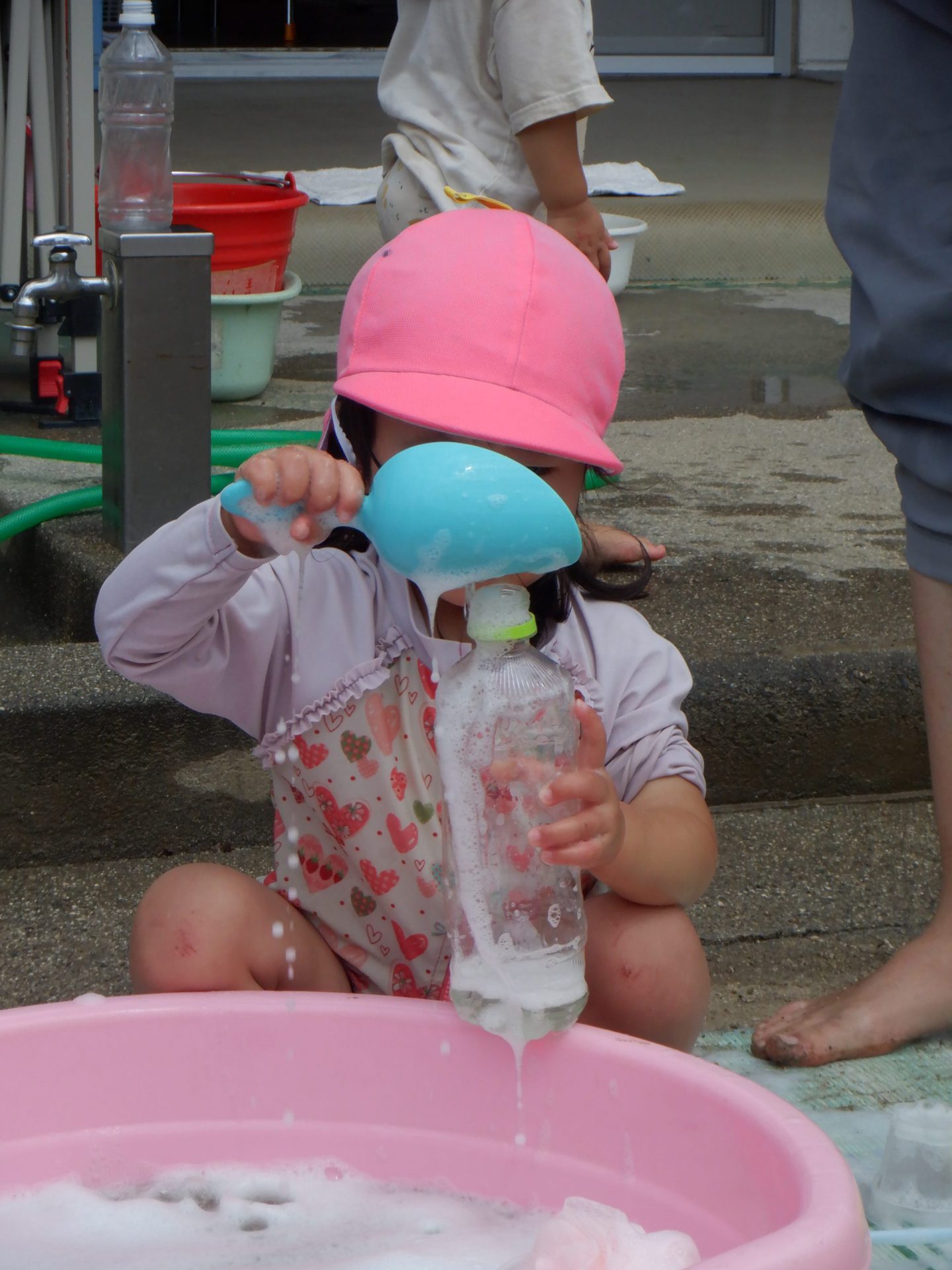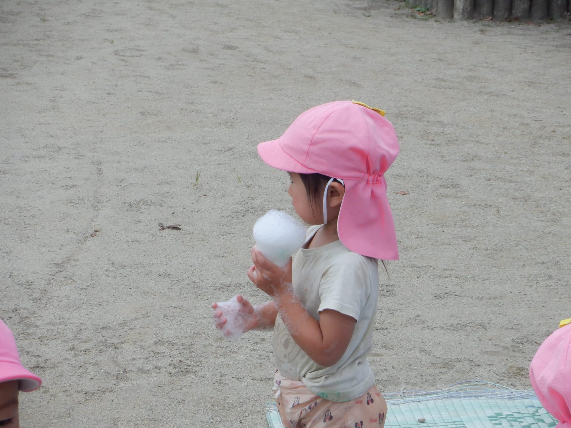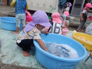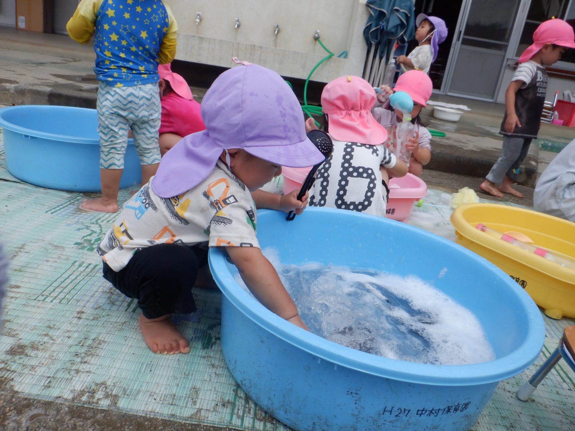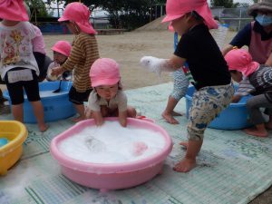 ・泡の感触を味わいながら長い時間集中して遊びを楽しむことができました。やはり始めは2歳児がタライの周りを囲んで遊んでいましたが、その様子を近くで見ていた1歳児、保育士の手を引き仲間に入って行く子もいましたが、2歳児がその場から離れるとそこに行き、2歳児がしていたことと同じことをやっている姿があり、小さくても保育士が促したり、誘ったりしなくても興味のあることには自ら取り組むことができること、見て学ぶことを改めて感じました。子どもたちが自ら遊びたくなるような環境作りをしていきたいと思います。