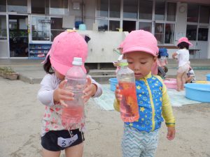 泡の中に食紅を入れて色をつけると・・・「ジュース!」と言って見せてくれます。