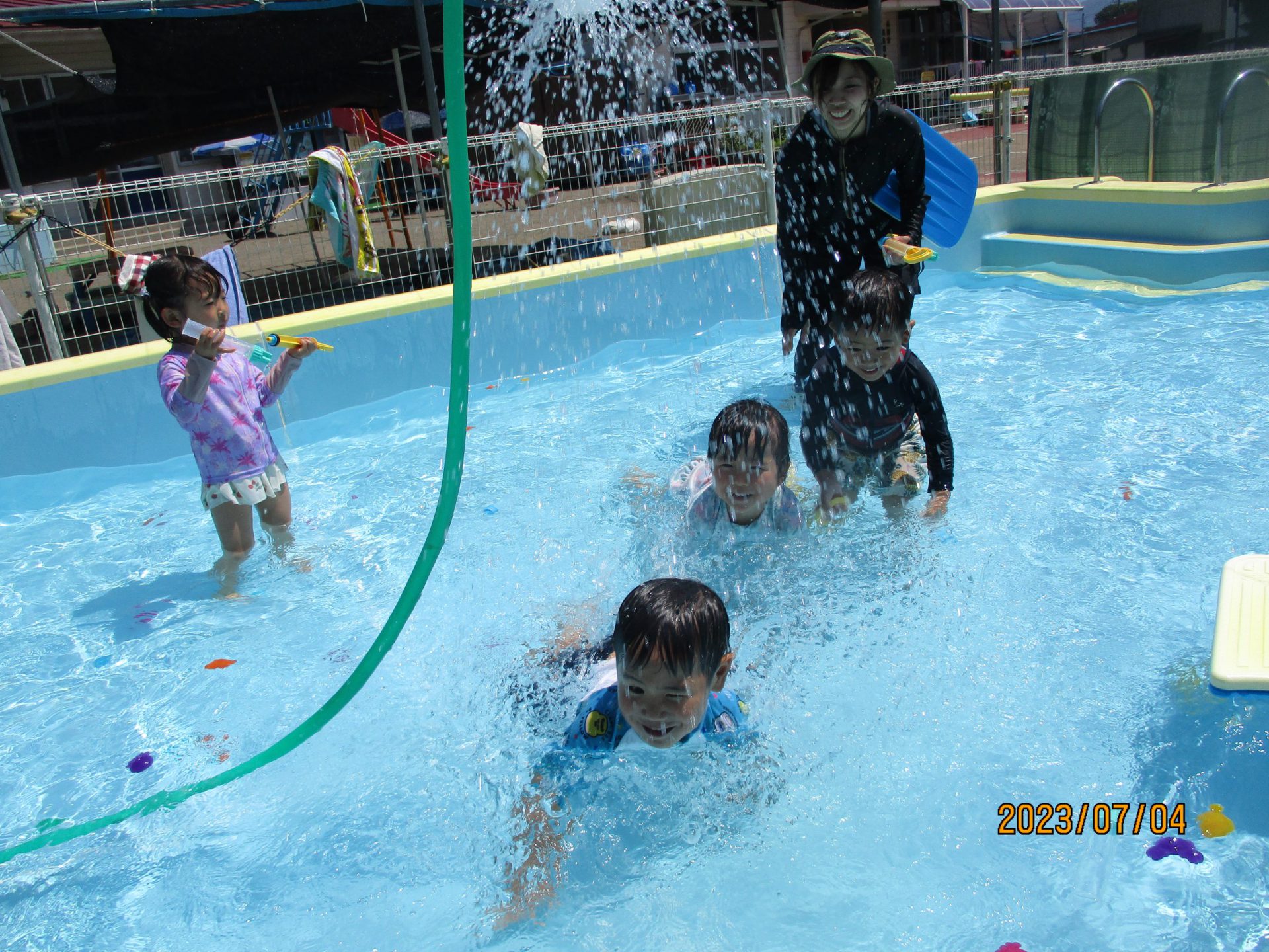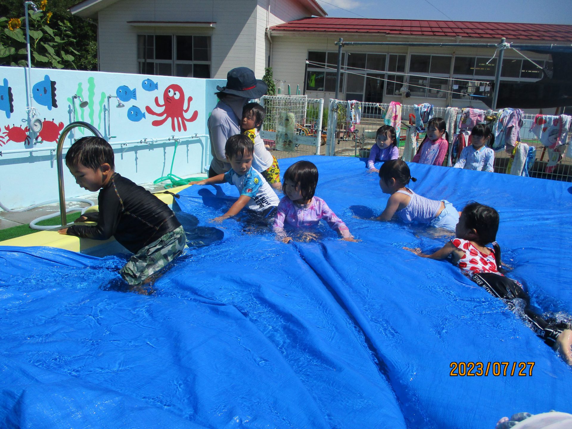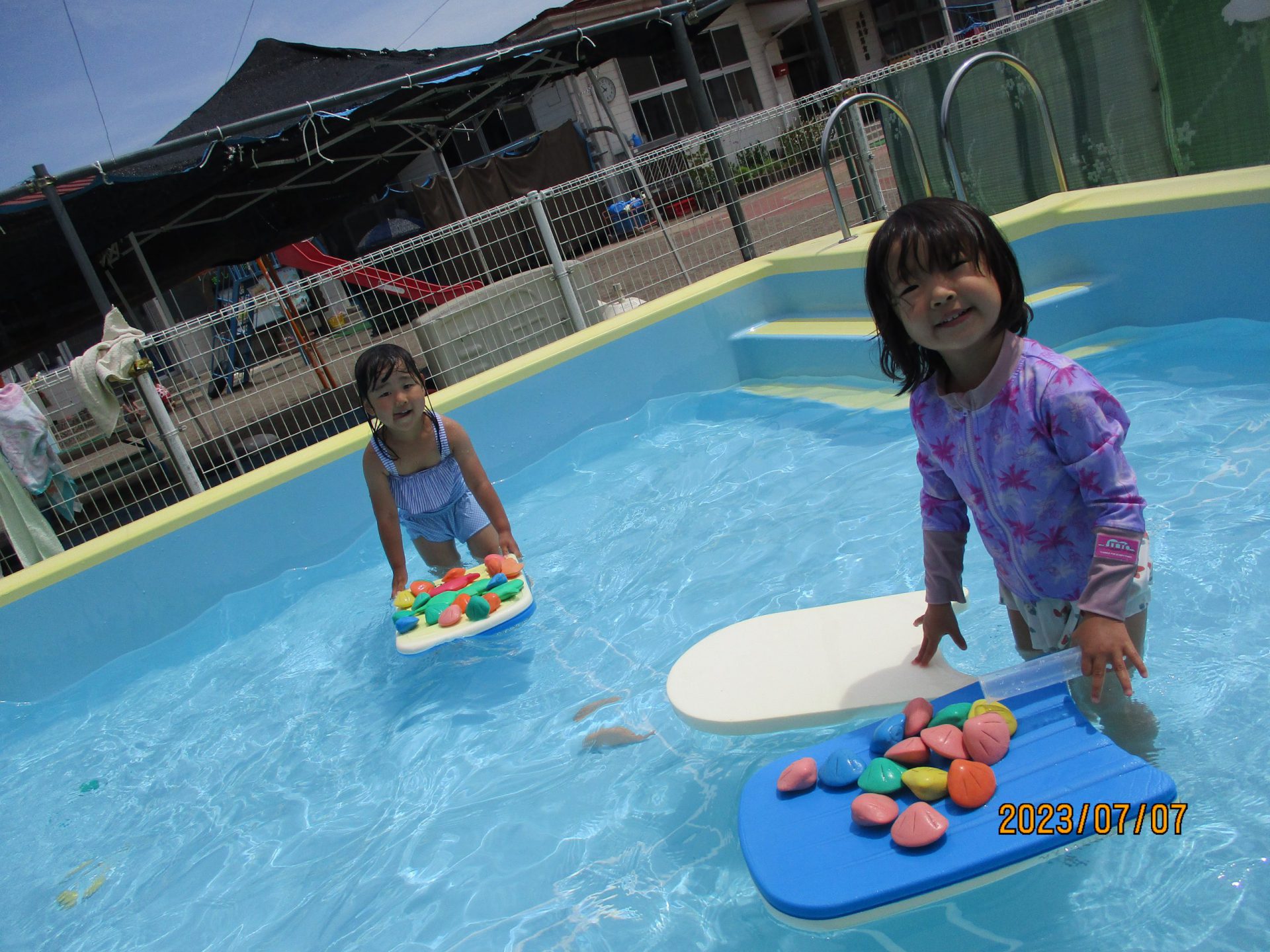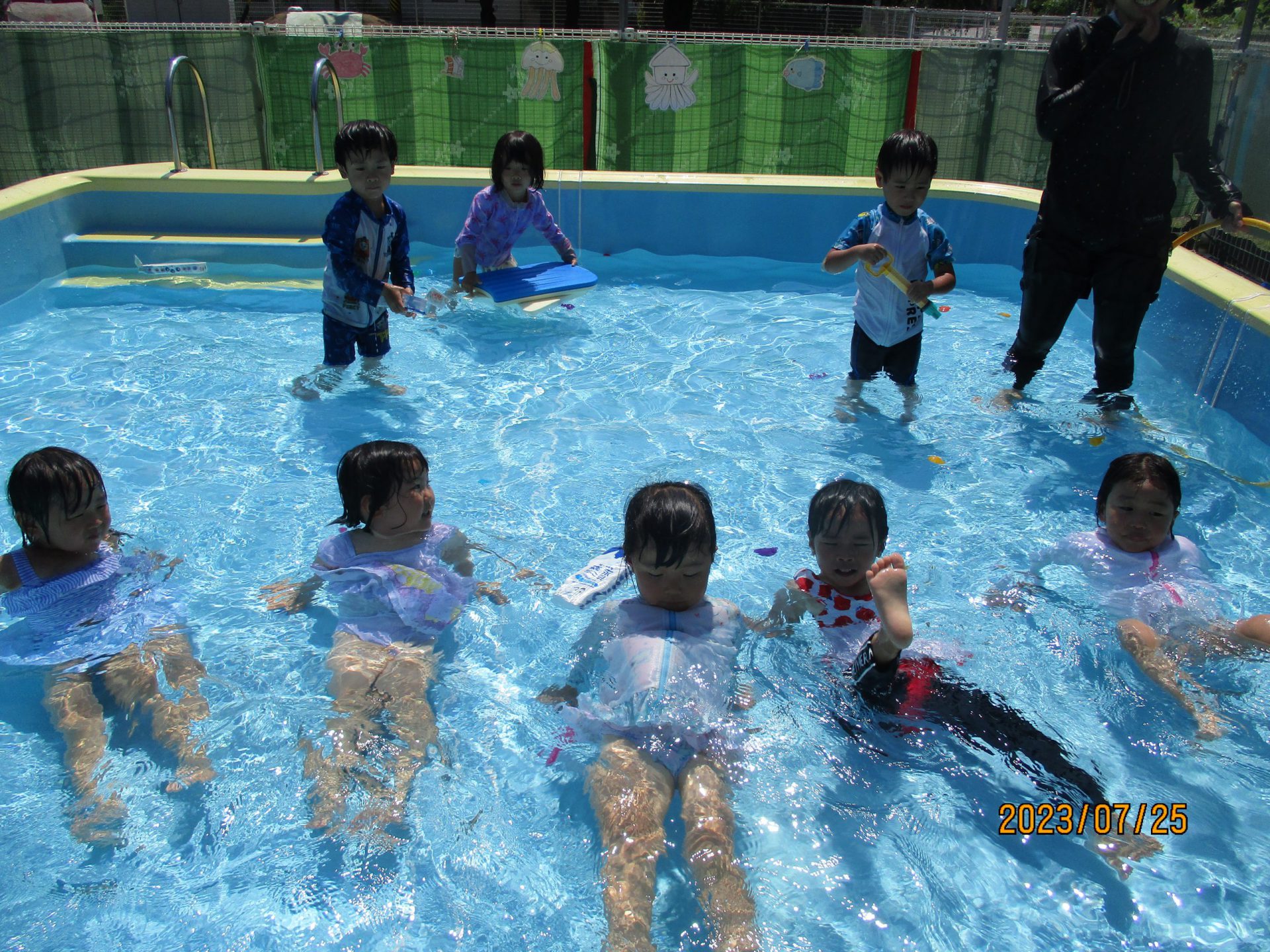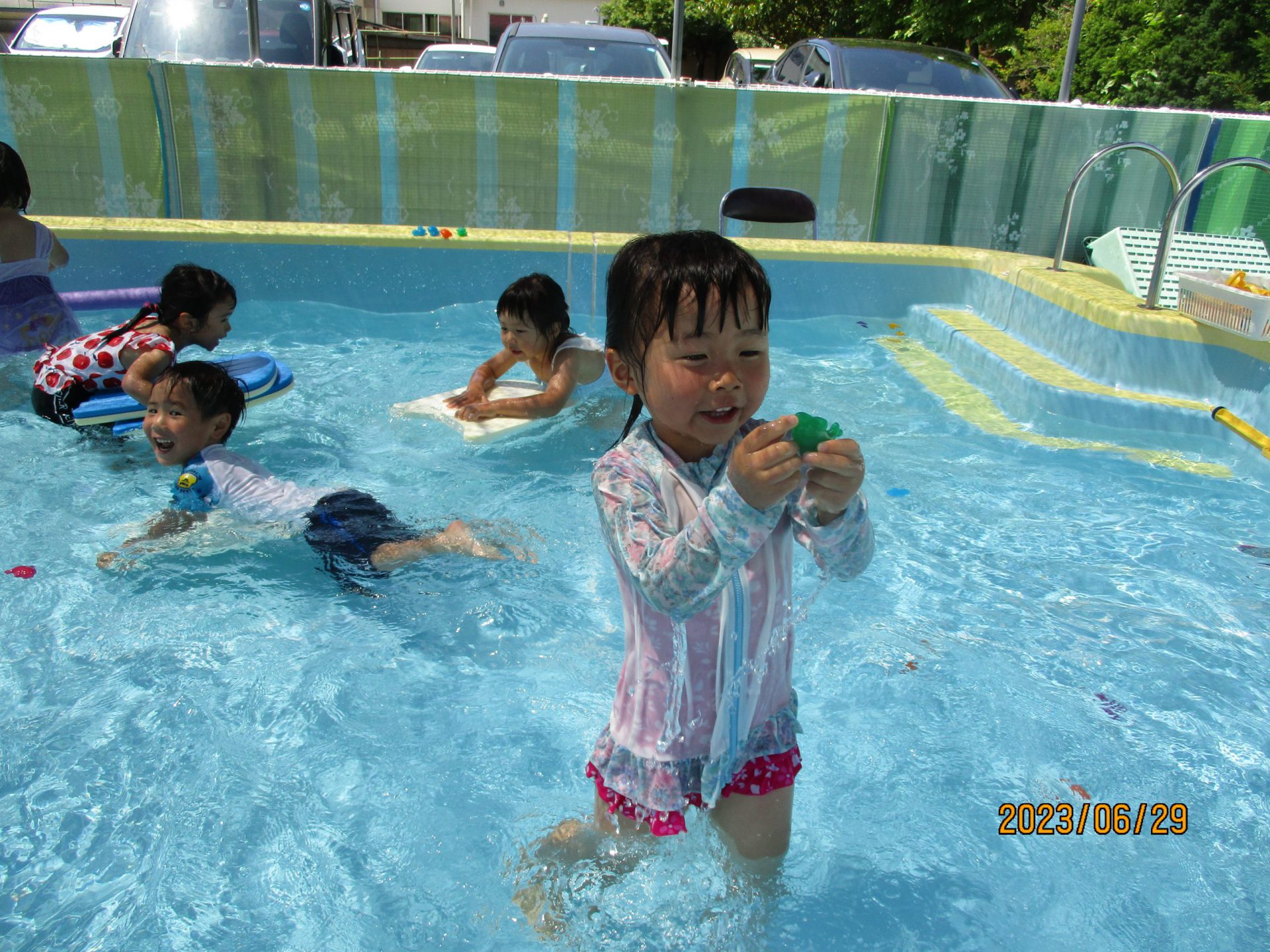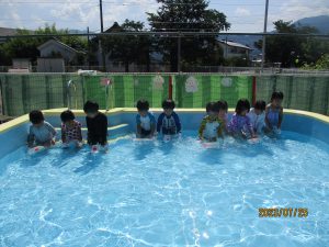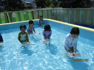 毎日「今日プール入る?」「〇だよ」と楽しみにしているピノキオ組の子ども達。