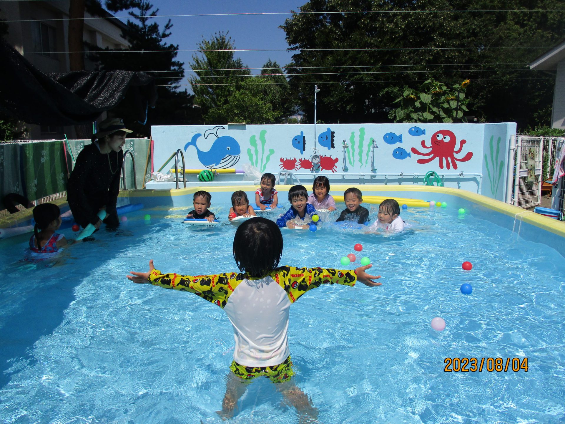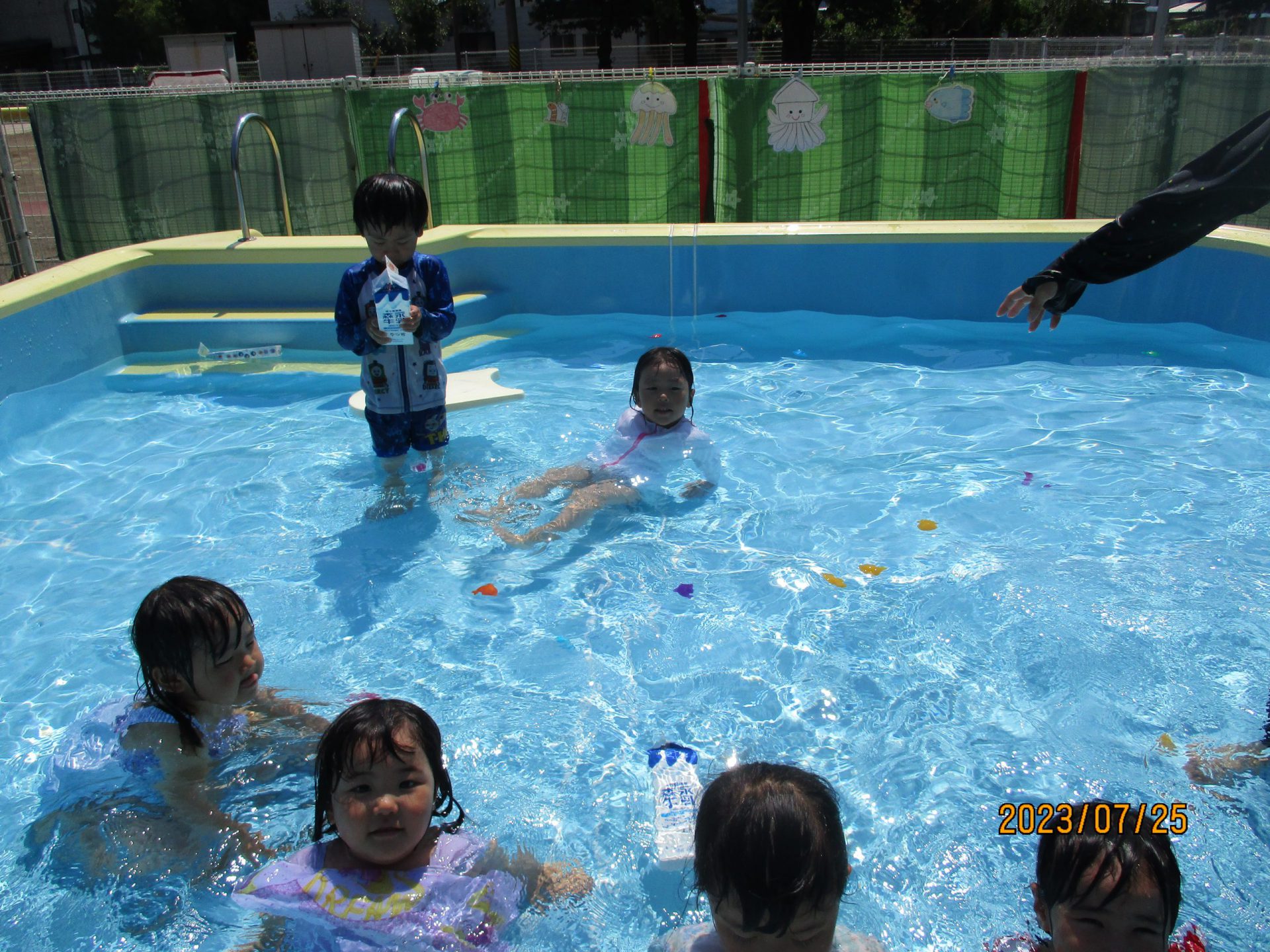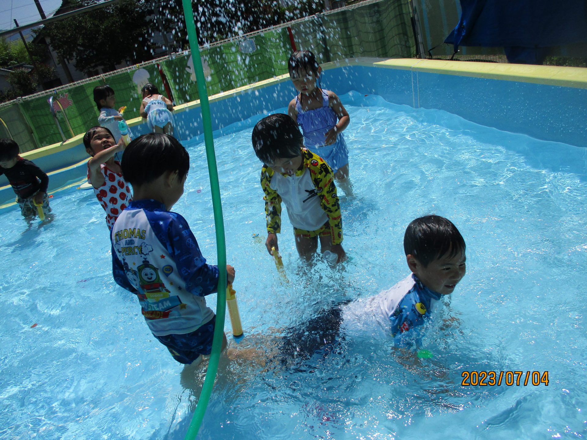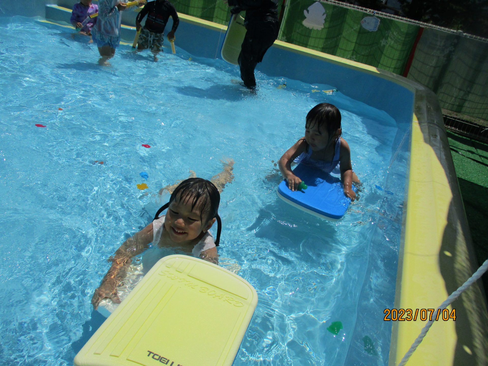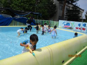 毎日「今日プール入る?」「〇だよ」と楽しみにしているピノキオ組の子ども達。