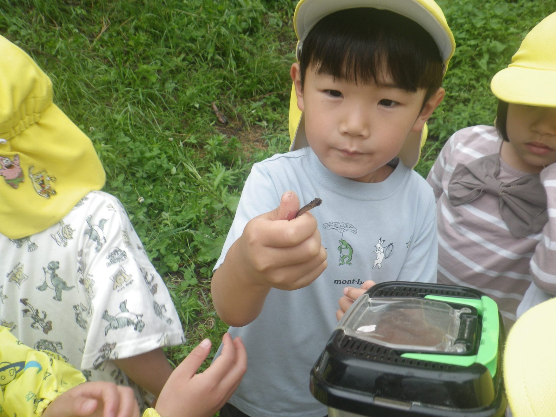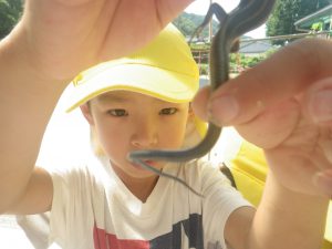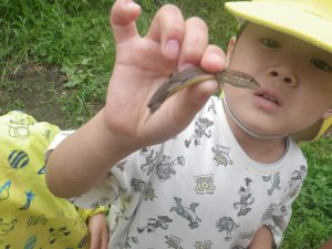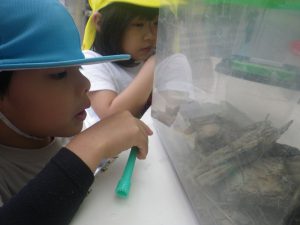 少し怖かったカナヘビが、毎日の観察や世話を通してとても身近な存在となり、小さい組さんに体験したことを教えてあげたり、地域交流で来て下さった方々に得意気に見せてお話したり、いろいろ教えてもらったりと、みんなで会話を楽しむ機会が多くなりました。