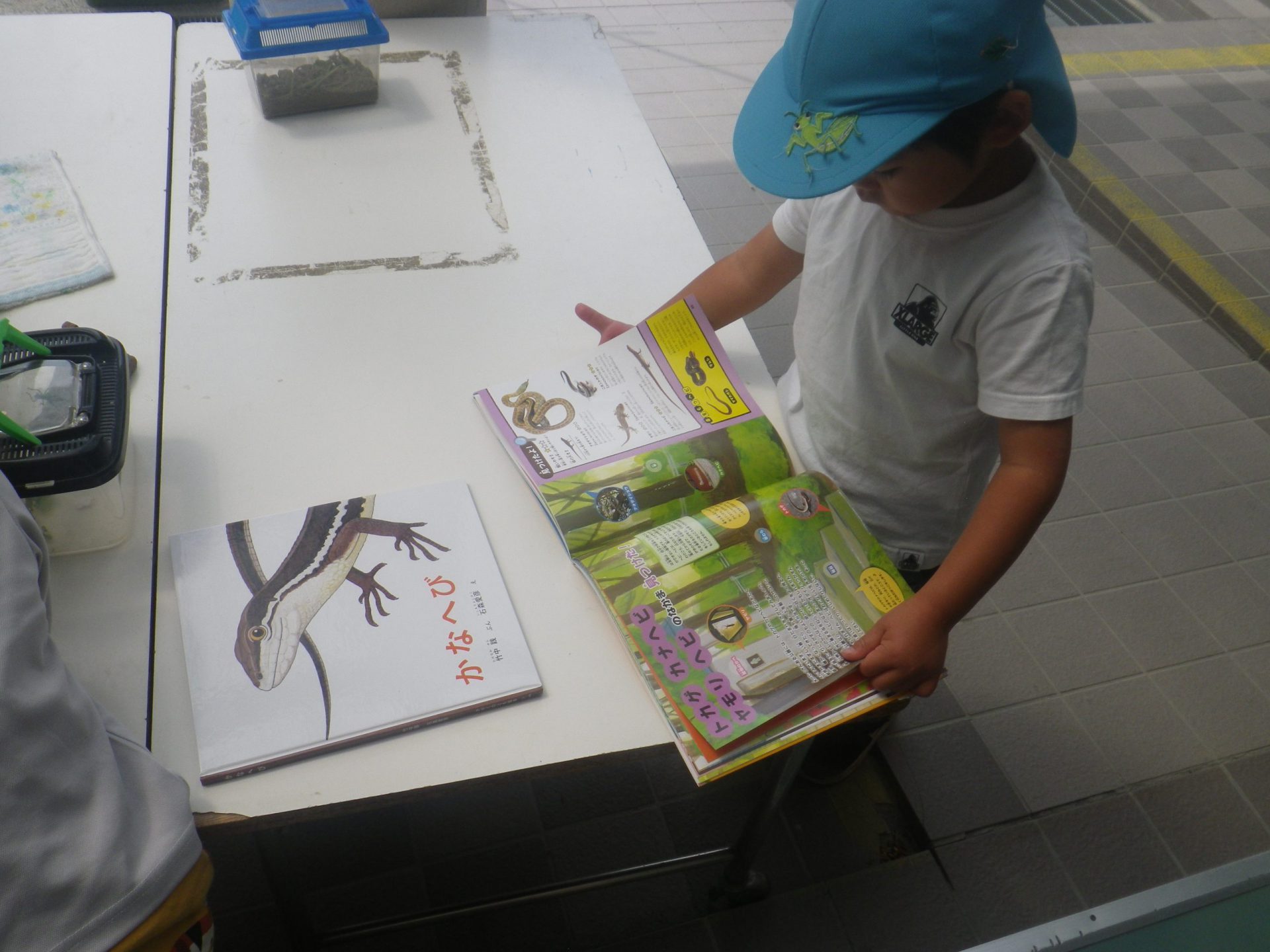 図鑑で調べながら「カナヘビさん何を食べるんだろうね?」「生きた虫だよ。」