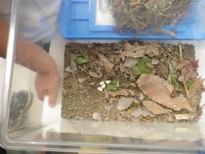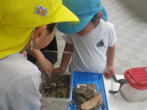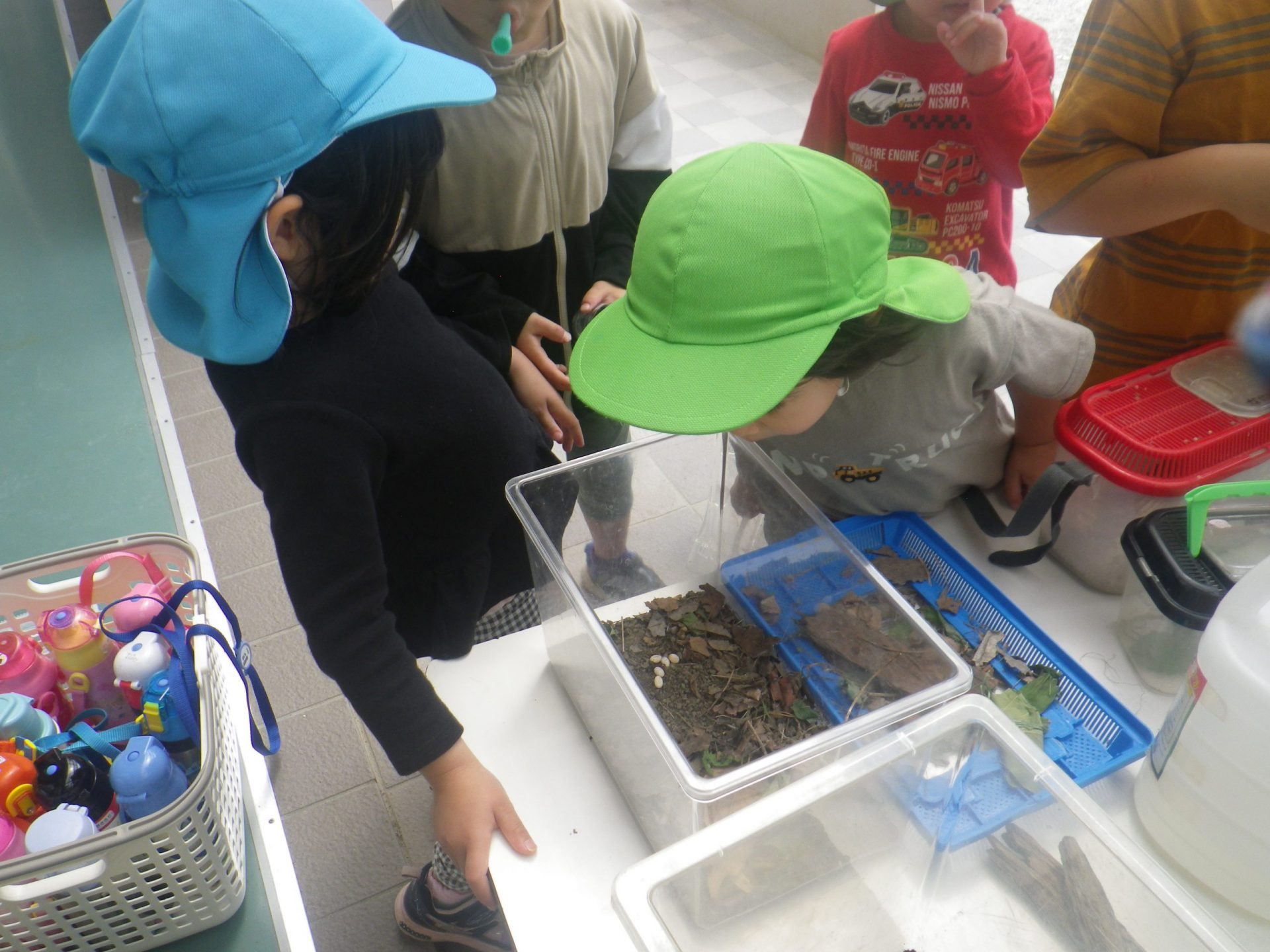 畑に行き、餌になる虫やカナヘビを見つけて楽しむ姿が日課になってきた頃、飼育箱の中に「あっ、白いものがある!卵じゃない?!」気付いた子がみんなに教えてくれました。