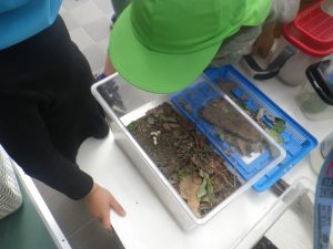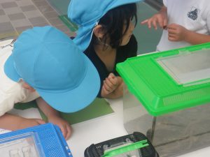 「カナヘビさんどうぞ。」捕まえてきた虫をカナヘビの飼育ケースに入れてあげます。「食べるかな?」「あっ、食べたよ。」