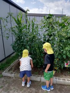 初めは子どもたちより小さかった野菜たちですが、水やりの成果もあり子どもたちの背をぐんぐん抜かしていきます。