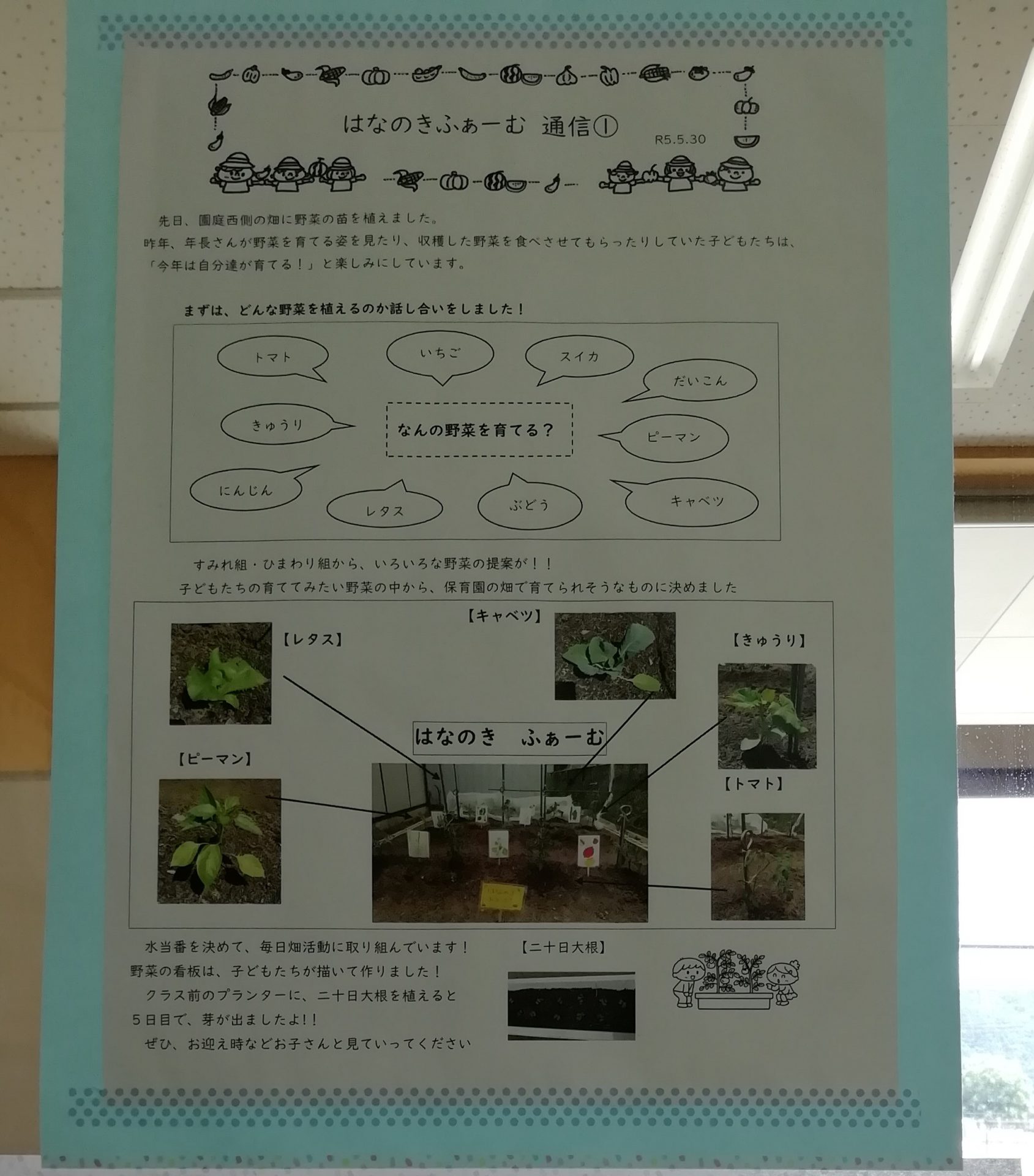 お家の方にもお便りでお知らせをすると、降園時に親子で畑の様子を見に行く姿が見られるようになりました。