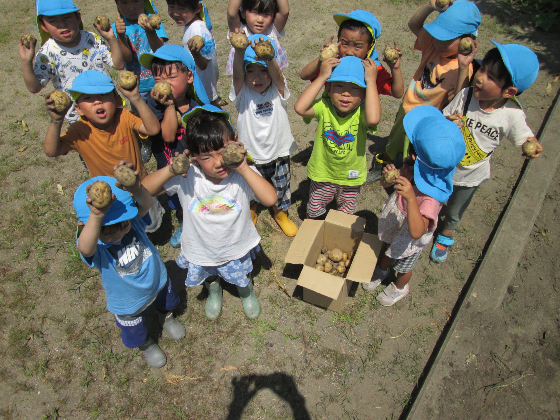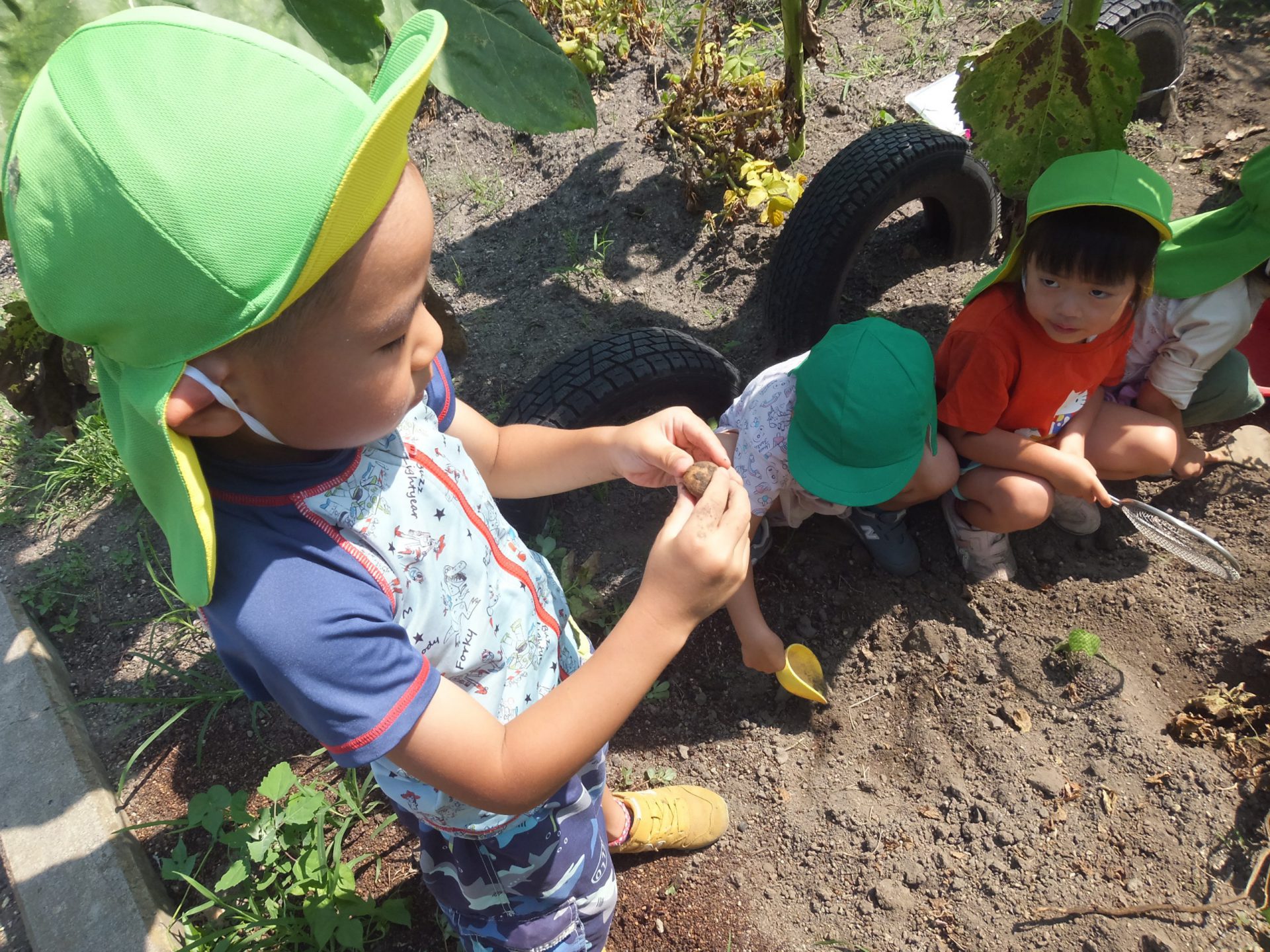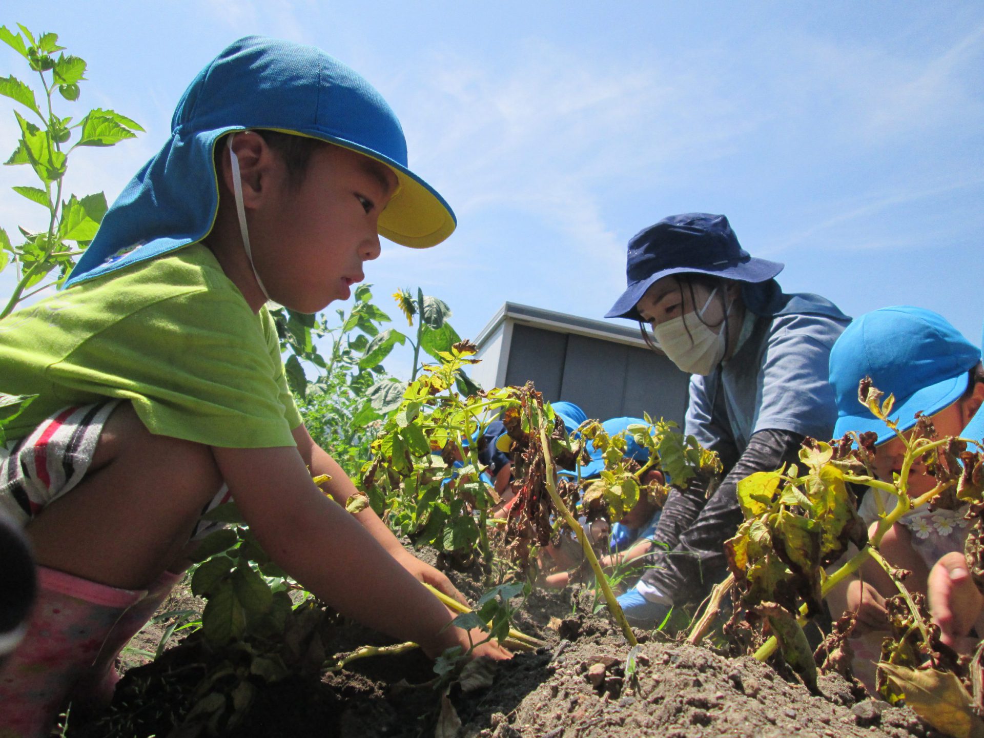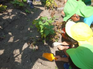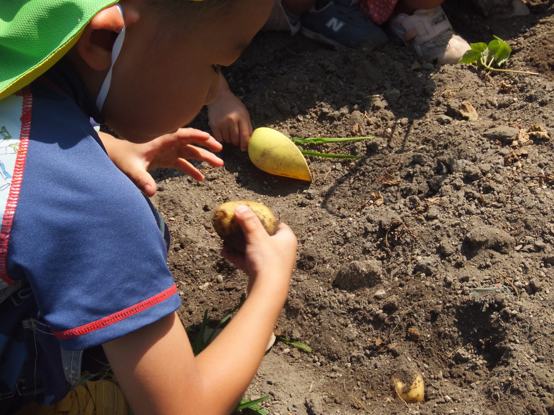 じゃがいも掘りの経験が初めての年少さん。昨年の経験もあって、土を一生懸命手で掘り進める掘り進める年中さん。じゃがいもを切らずに掘るために、試行錯誤する年長さん。それぞれの年齢の育ちを見ることができました。