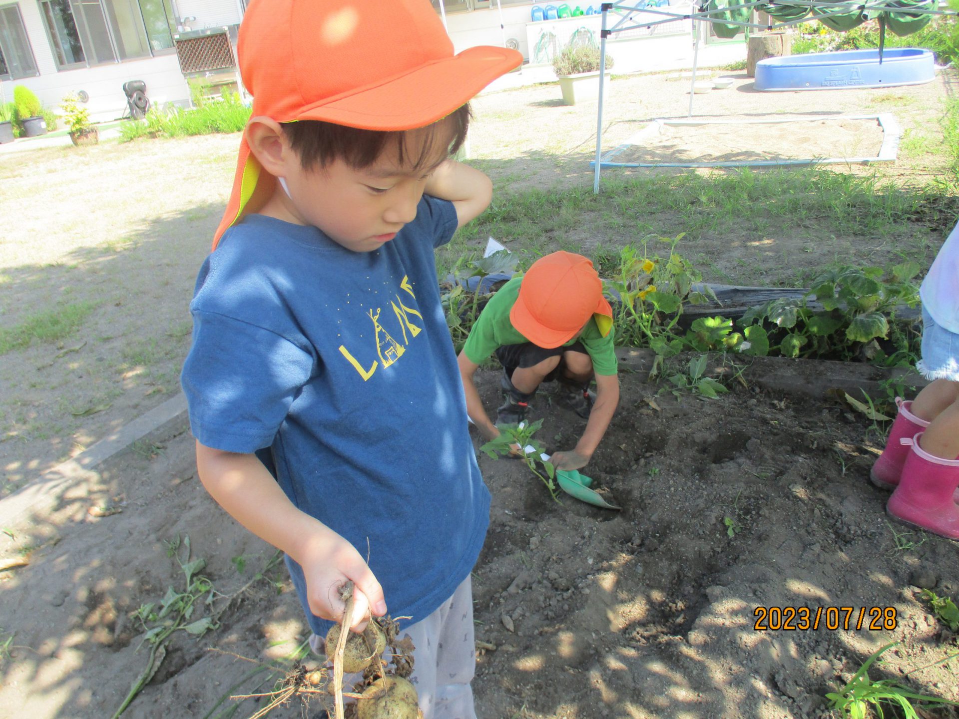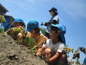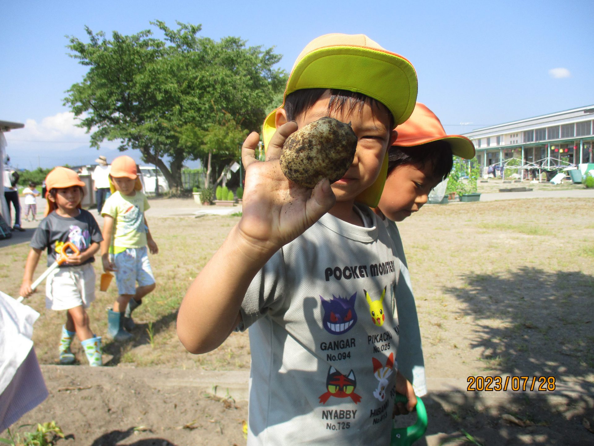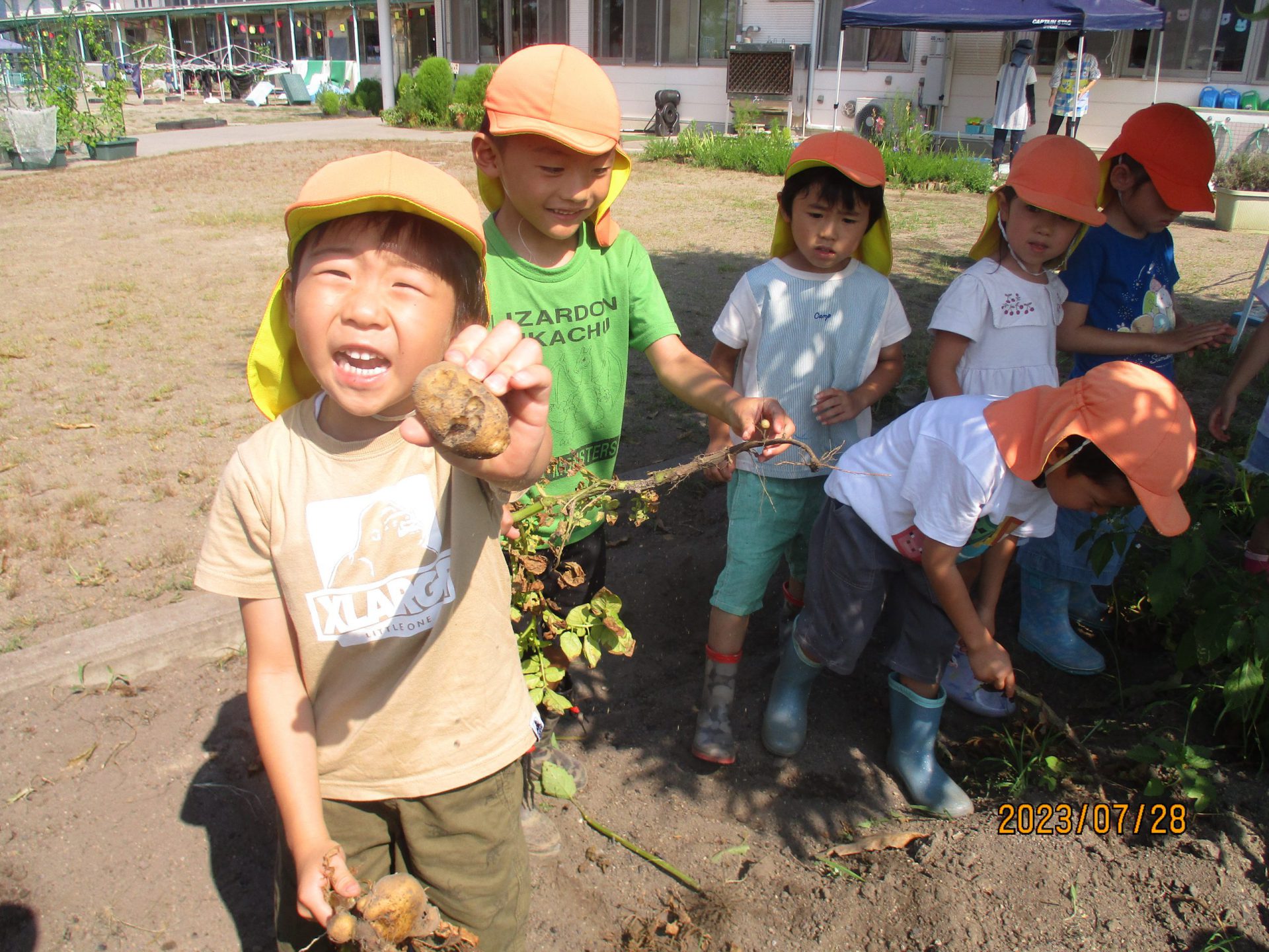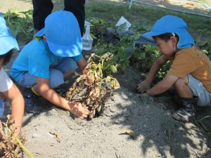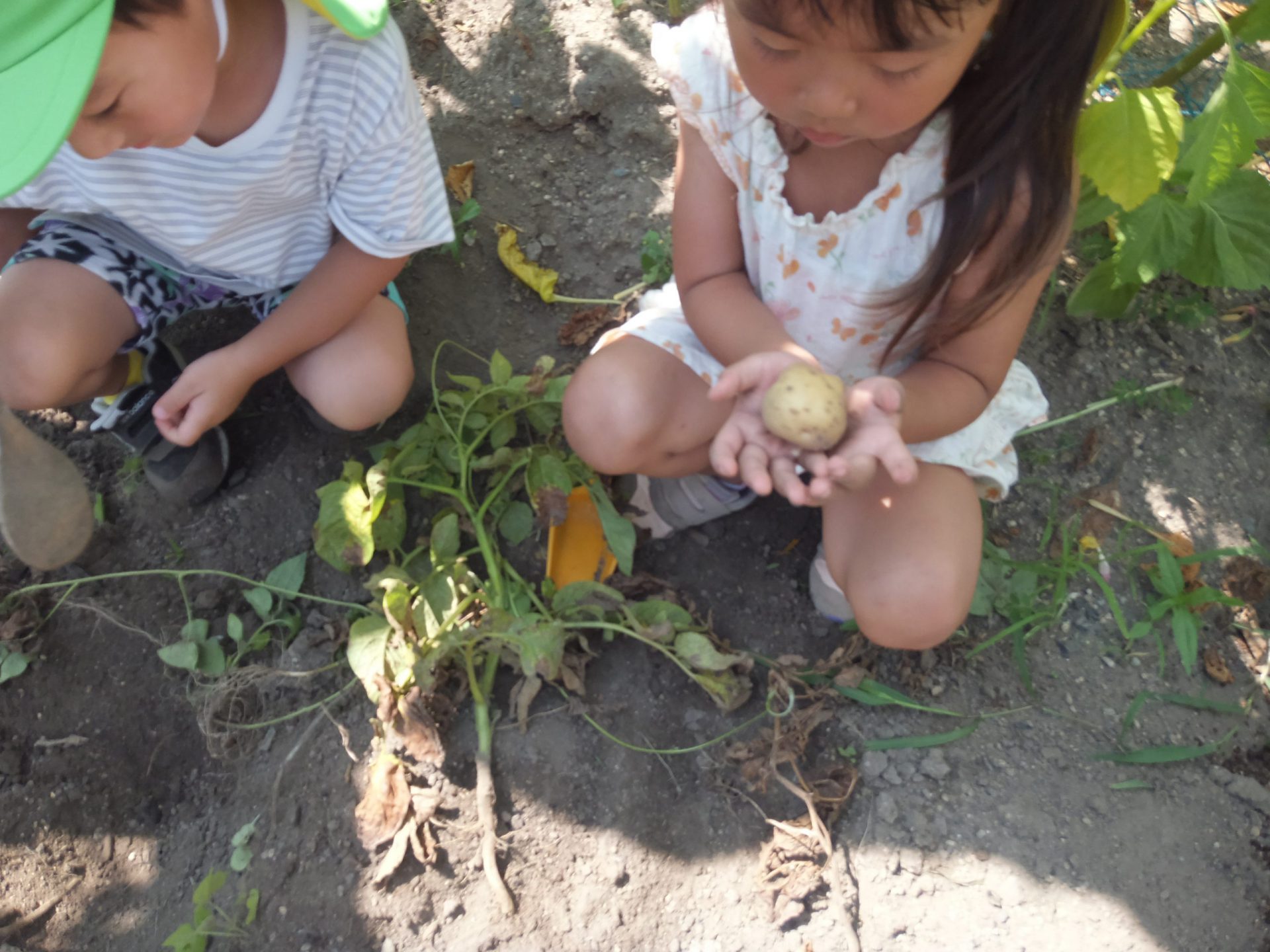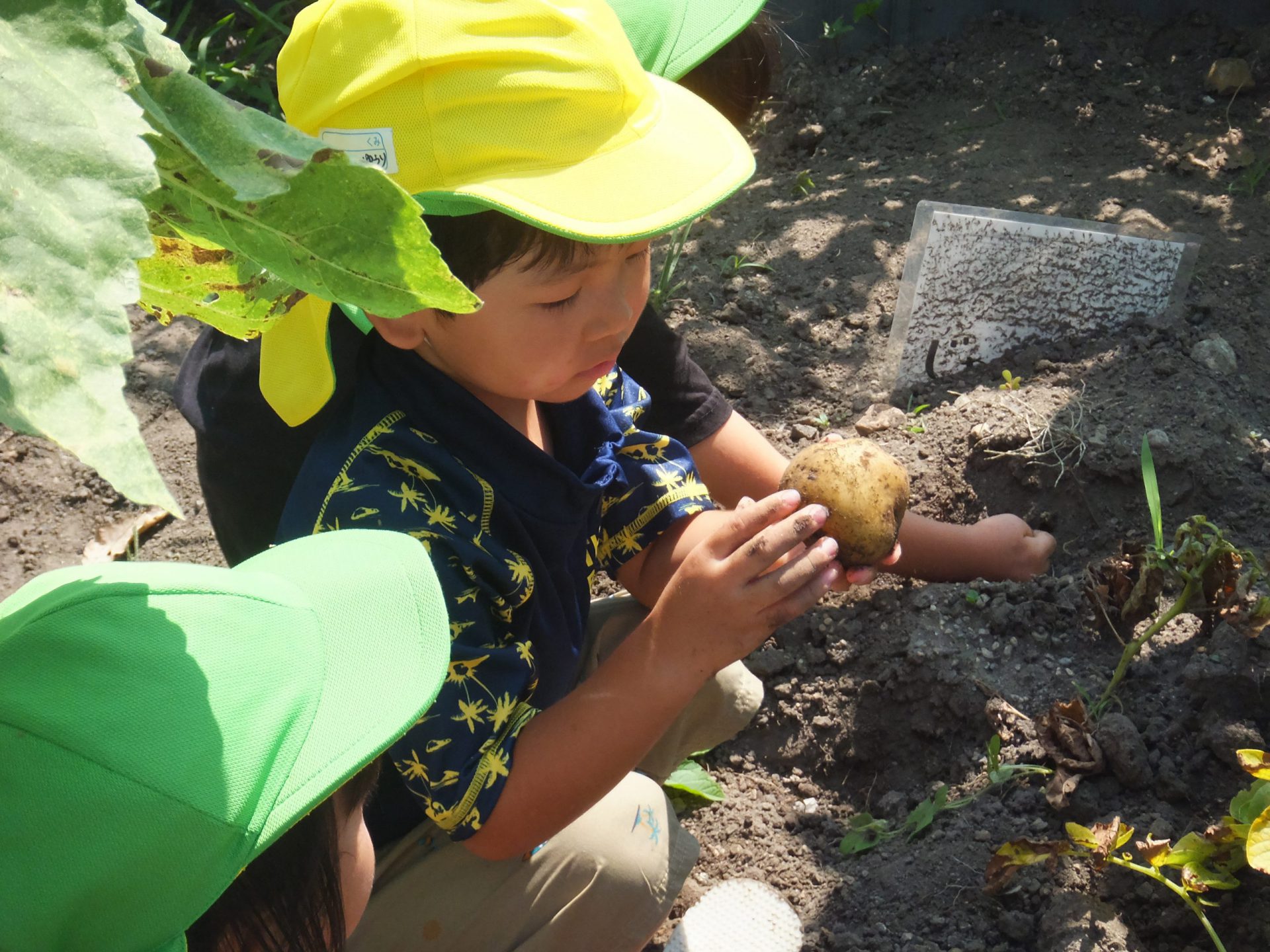 じゃがいも掘りの経験が初めての年少さん。昨年の経験もあって、土を一生懸命手で掘り進める掘り進める年中さん。じゃがいもを切らずに掘るために、試行錯誤する年長さん。それぞれの年齢の育ちを見ることができました。