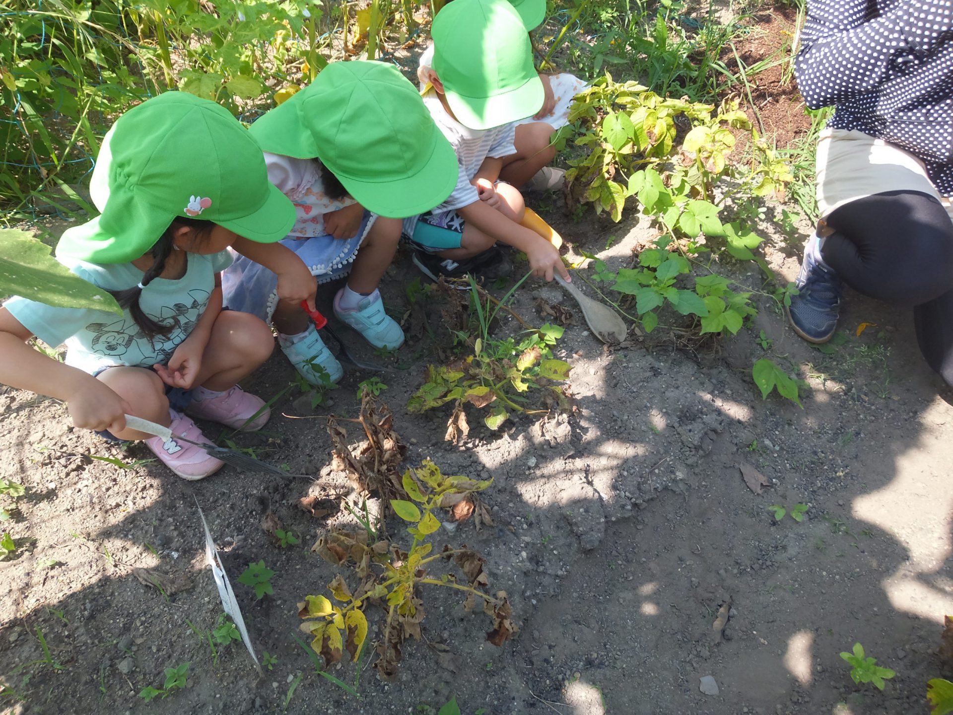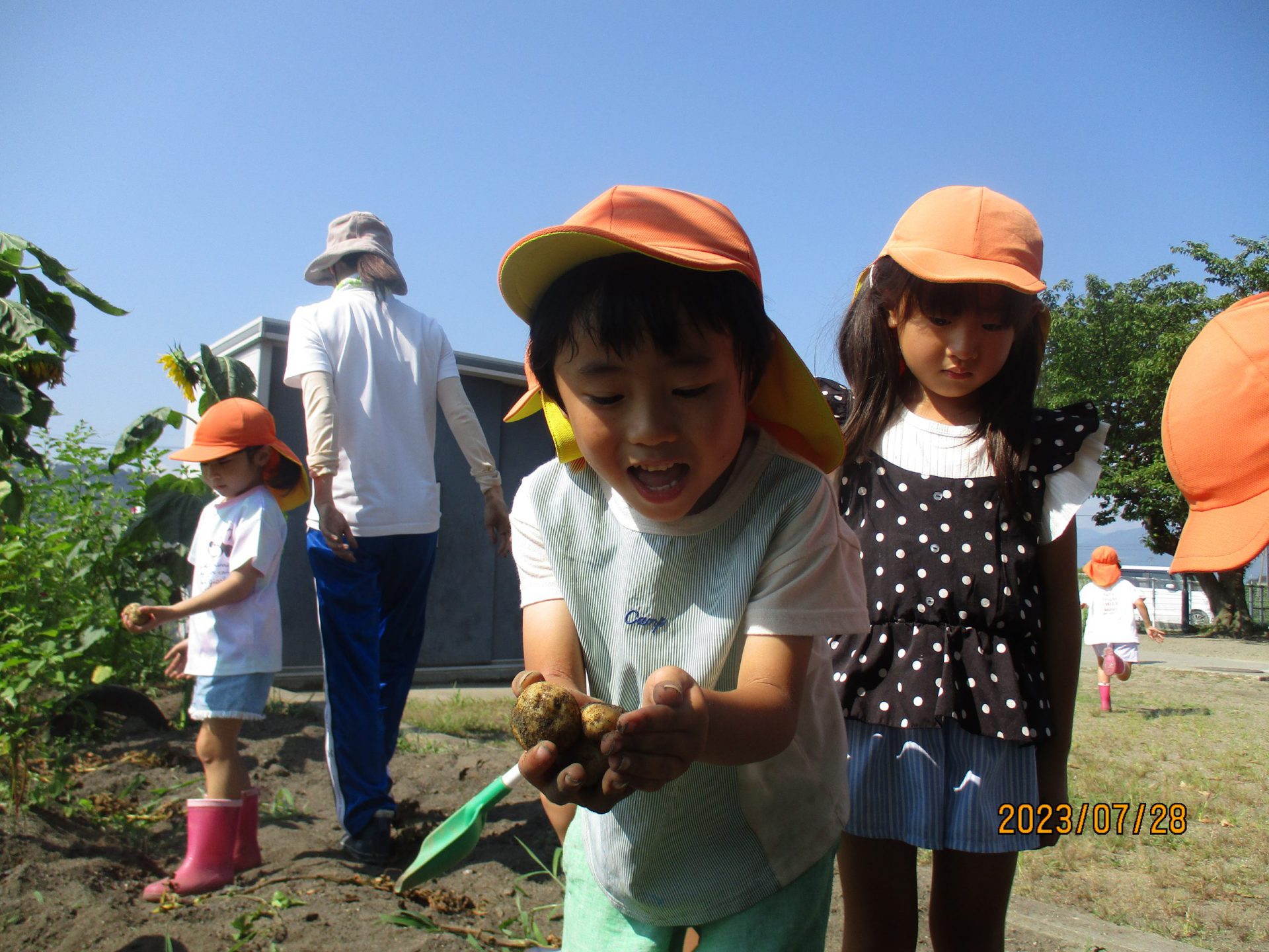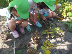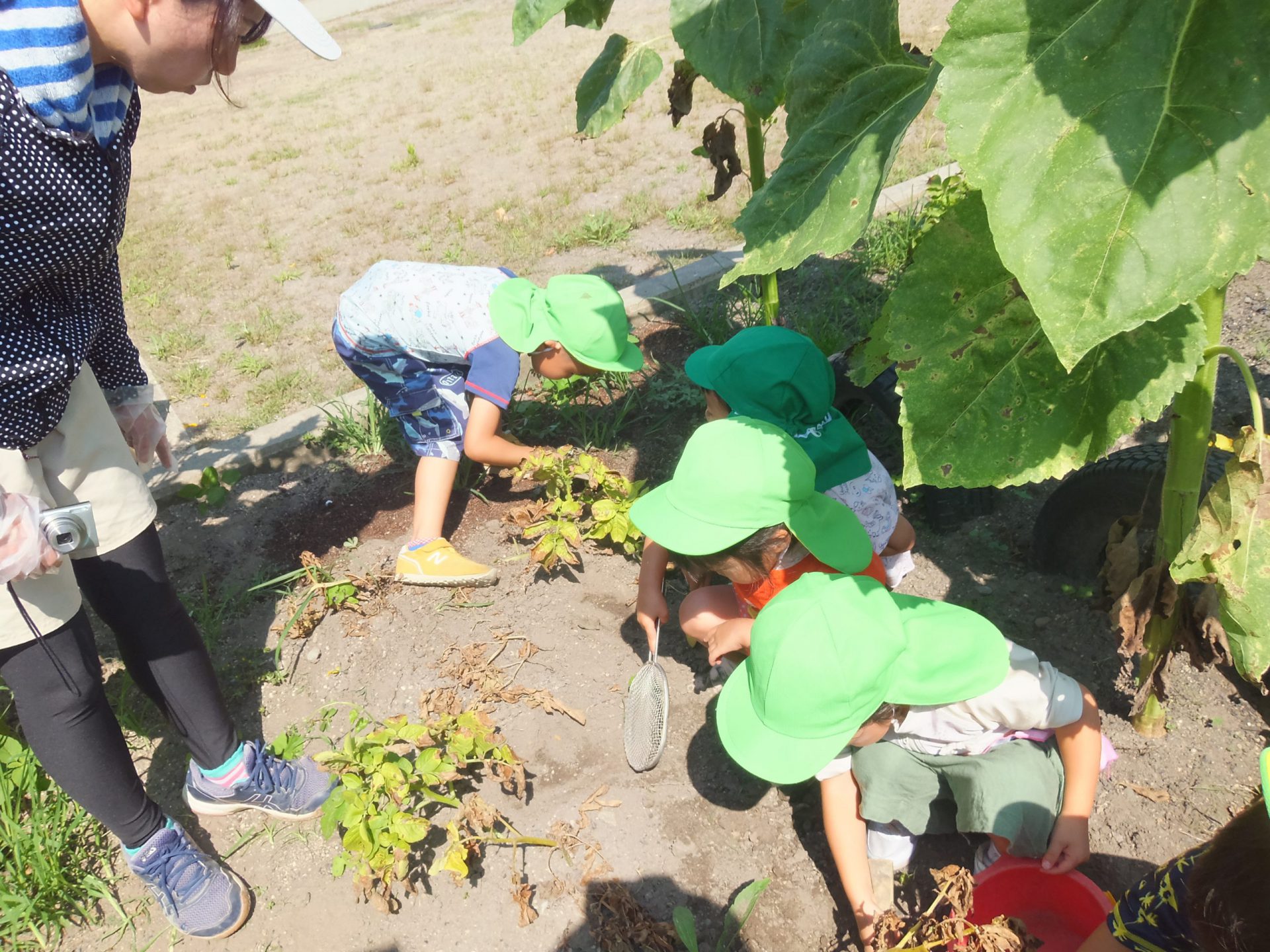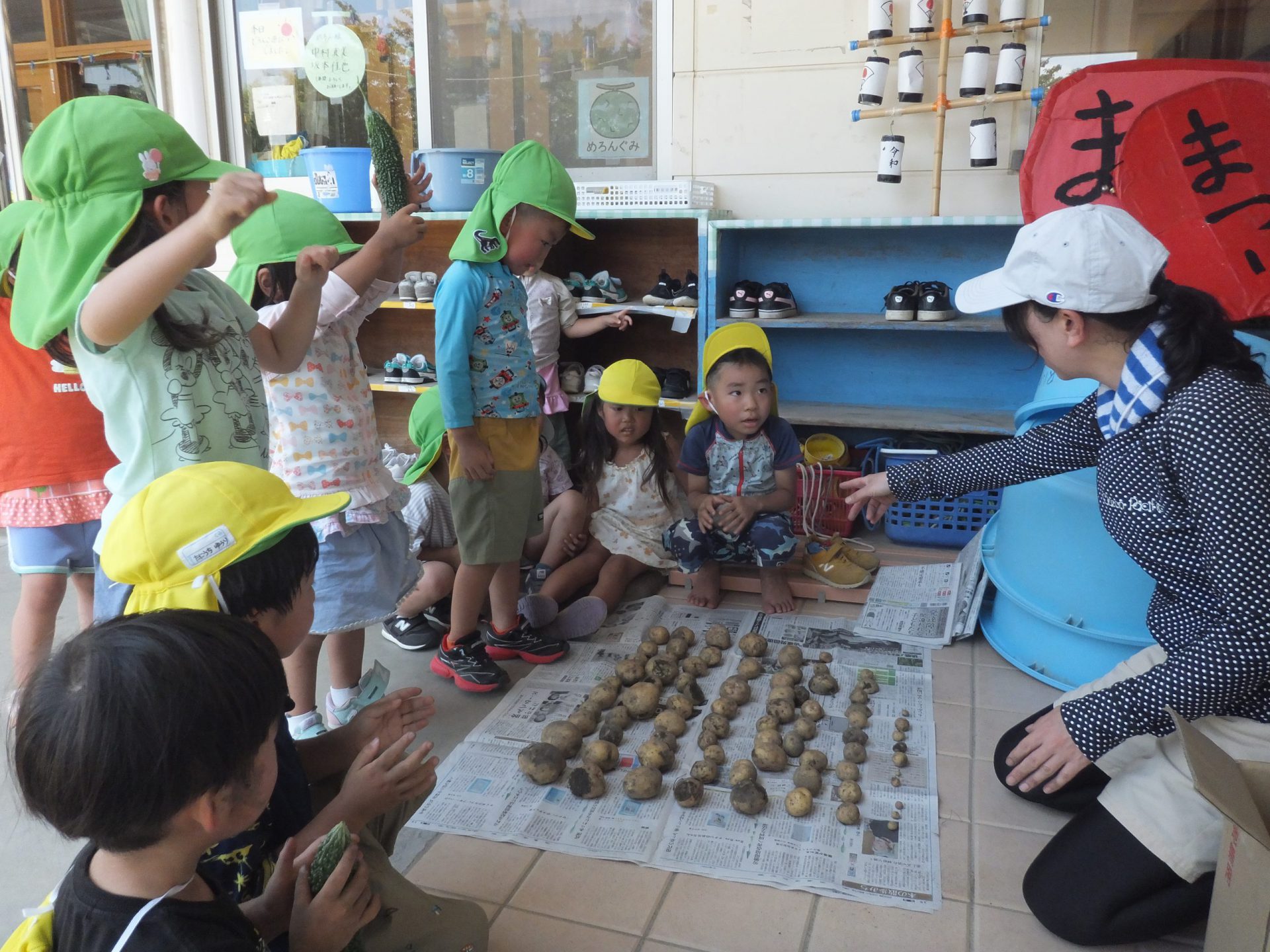 じゃがいも掘りの経験が初めての年少さん。昨年の経験もあって、土を一生懸命手で掘り進める掘り進める年中さん。じゃがいもを切らずに掘るために、試行錯誤する年長さん。それぞれの年齢の育ちを見ることができました。