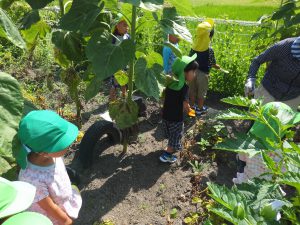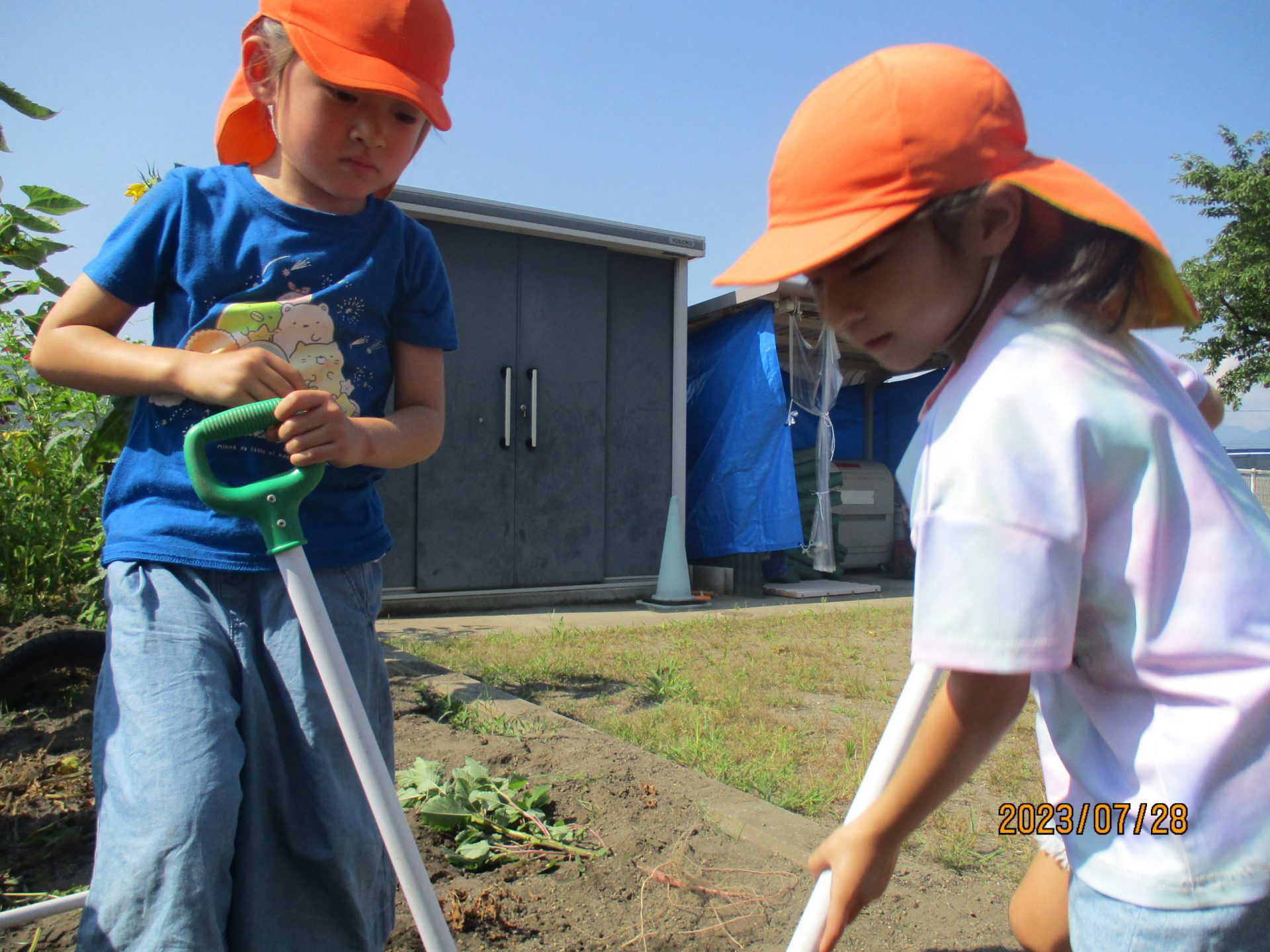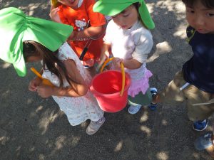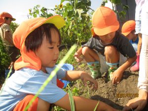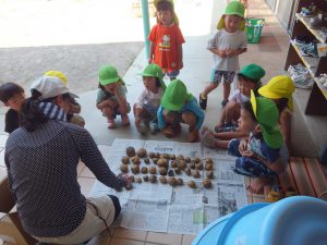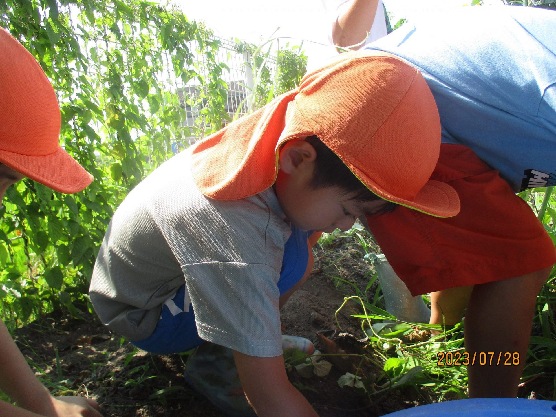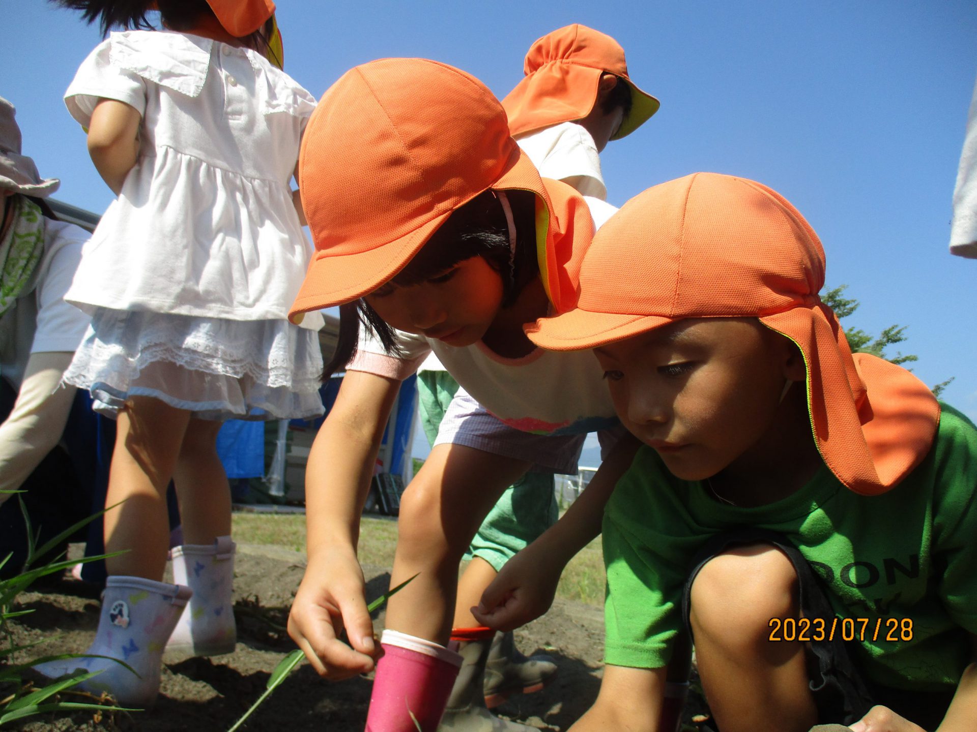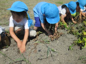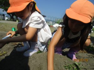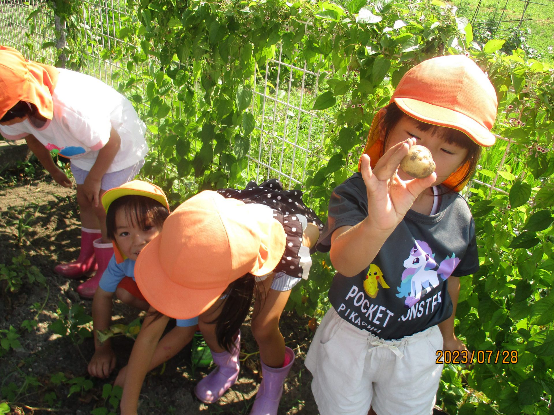 じゃがいも掘りの経験が初めての年少さん。昨年の経験もあって、土を一生懸命手で掘り進める掘り進める年中さん。じゃがいもを切らずに掘るために、試行錯誤する年長さん。それぞれの年齢の育ちを見ることができました。