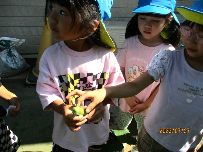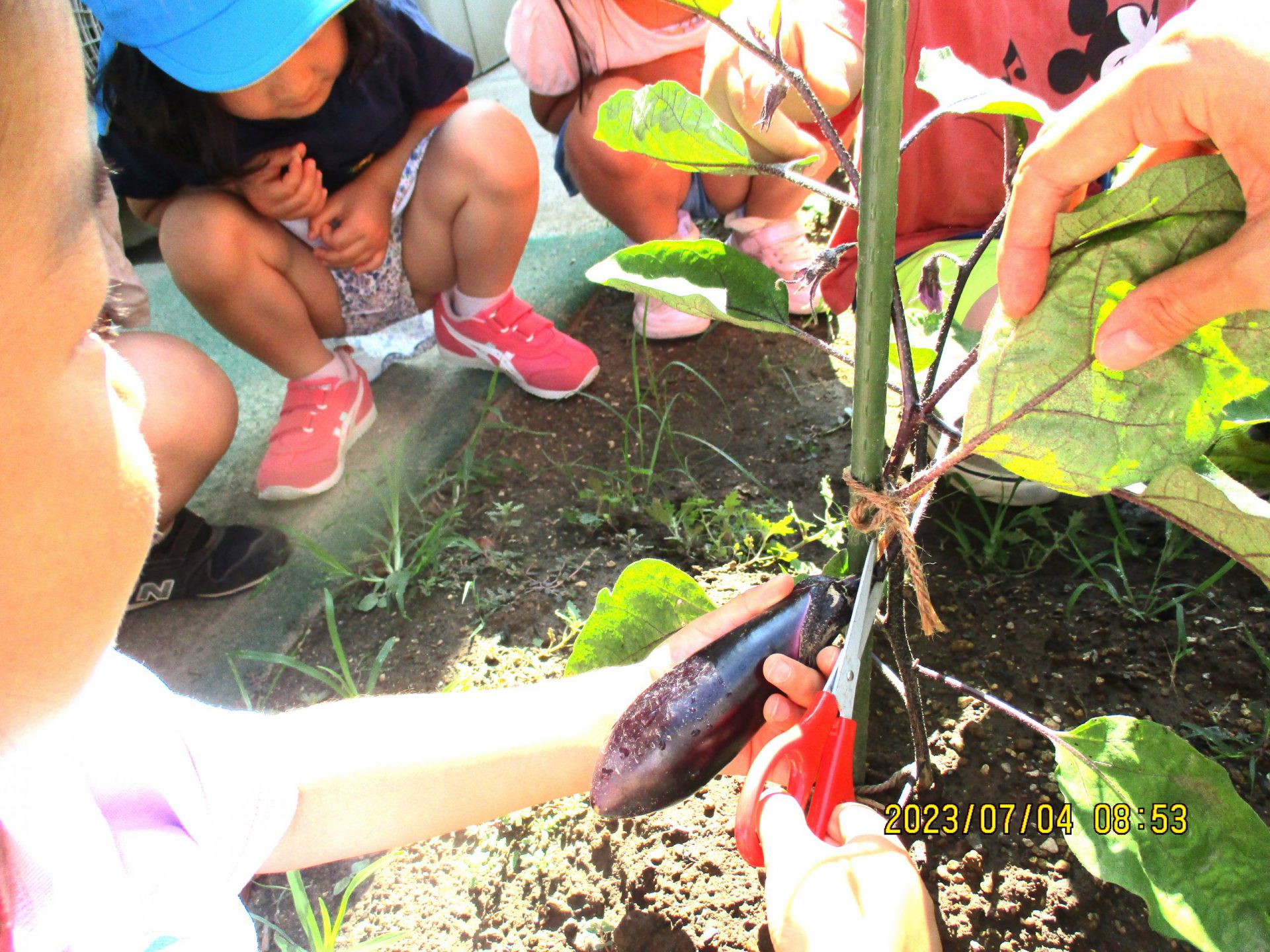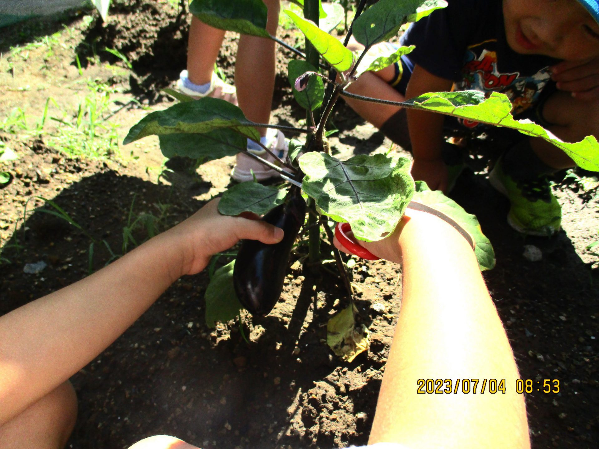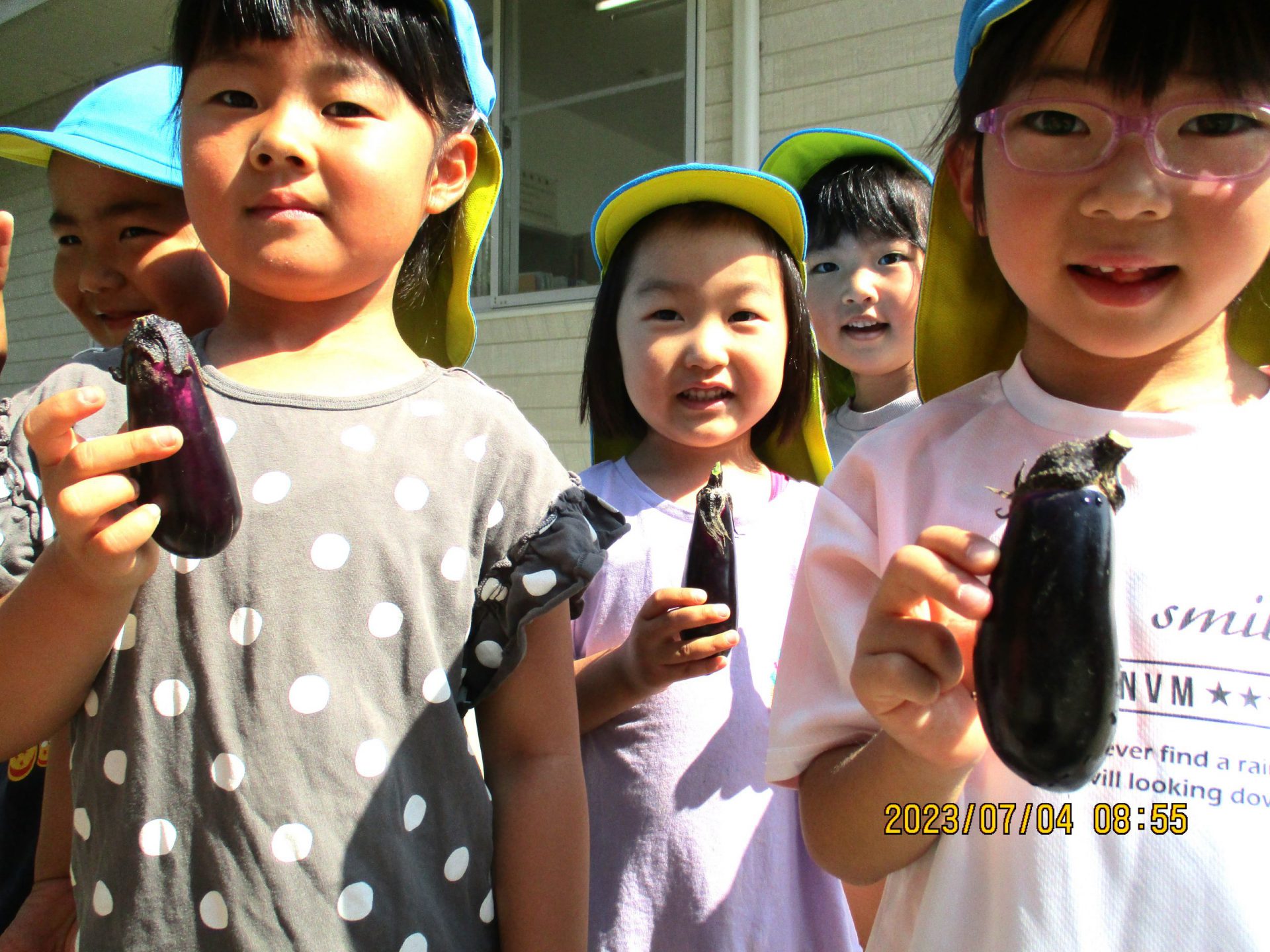 ・ナスやオクラを触りながら、「ツルツルしてる」「毛が生えててフワフワだ!」と、手触りの違いに気付く姿がありました。