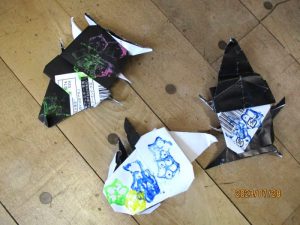 折り紙で作ったカブトムシにも、スタンプを押してデコレーションしていました。