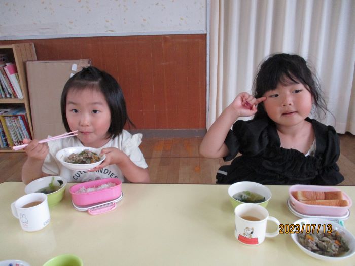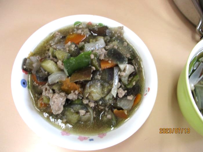 給食の麻婆ナスに入れてもらいました。「おいしい~」とニコニコ顔です😊