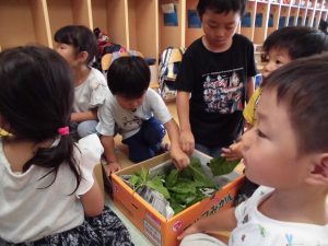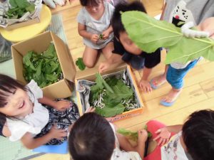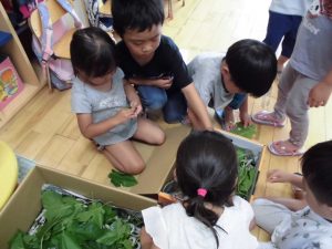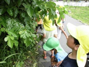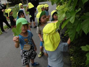 子どもたちは葉を触ったり、匂いを嗅いだりしながら「この形だ」「この匂いで合ってる」と言って葉を摘みました。