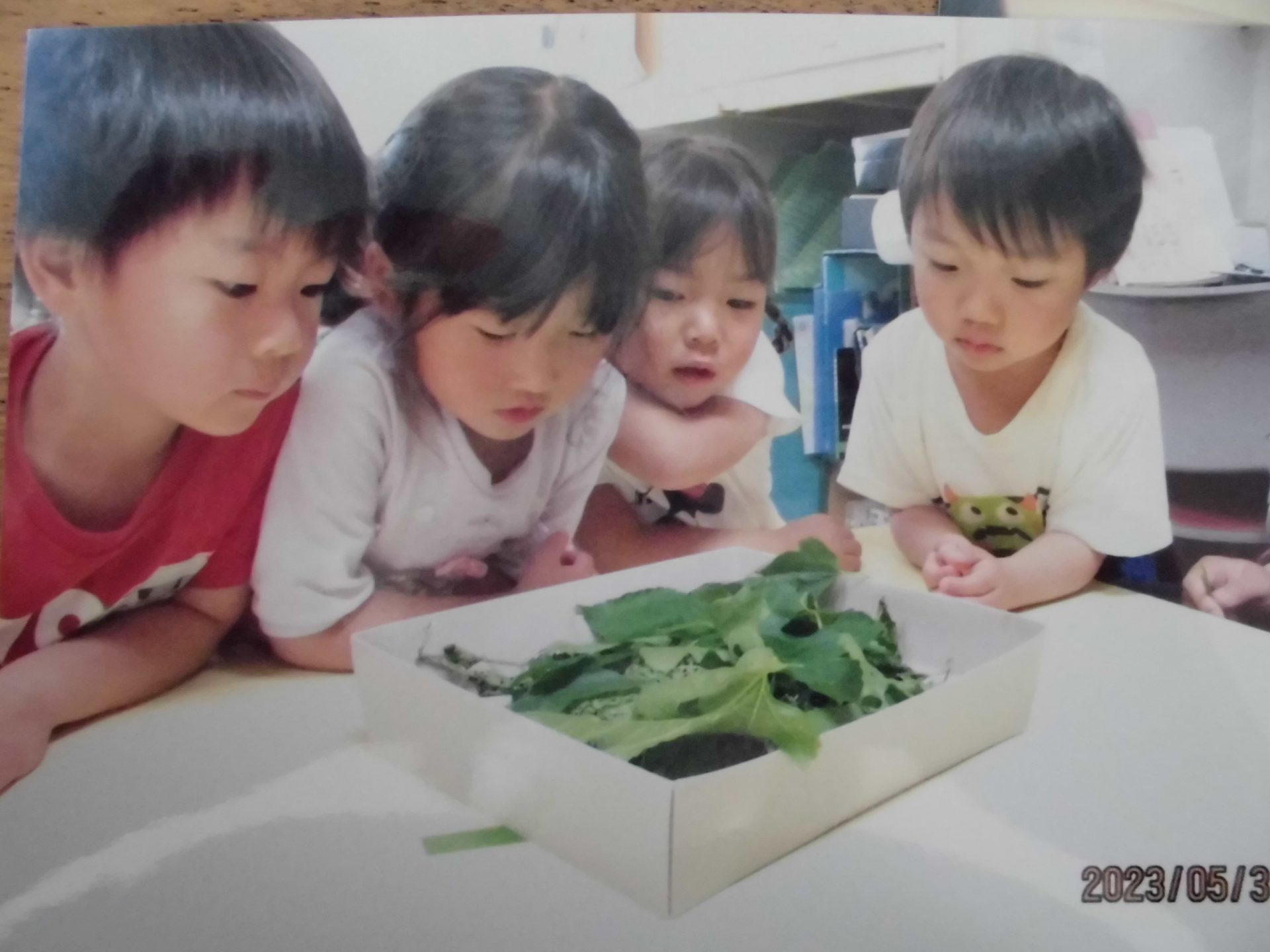 蚕の様子を見たり、餌をあげる姿が見られるようになりました。