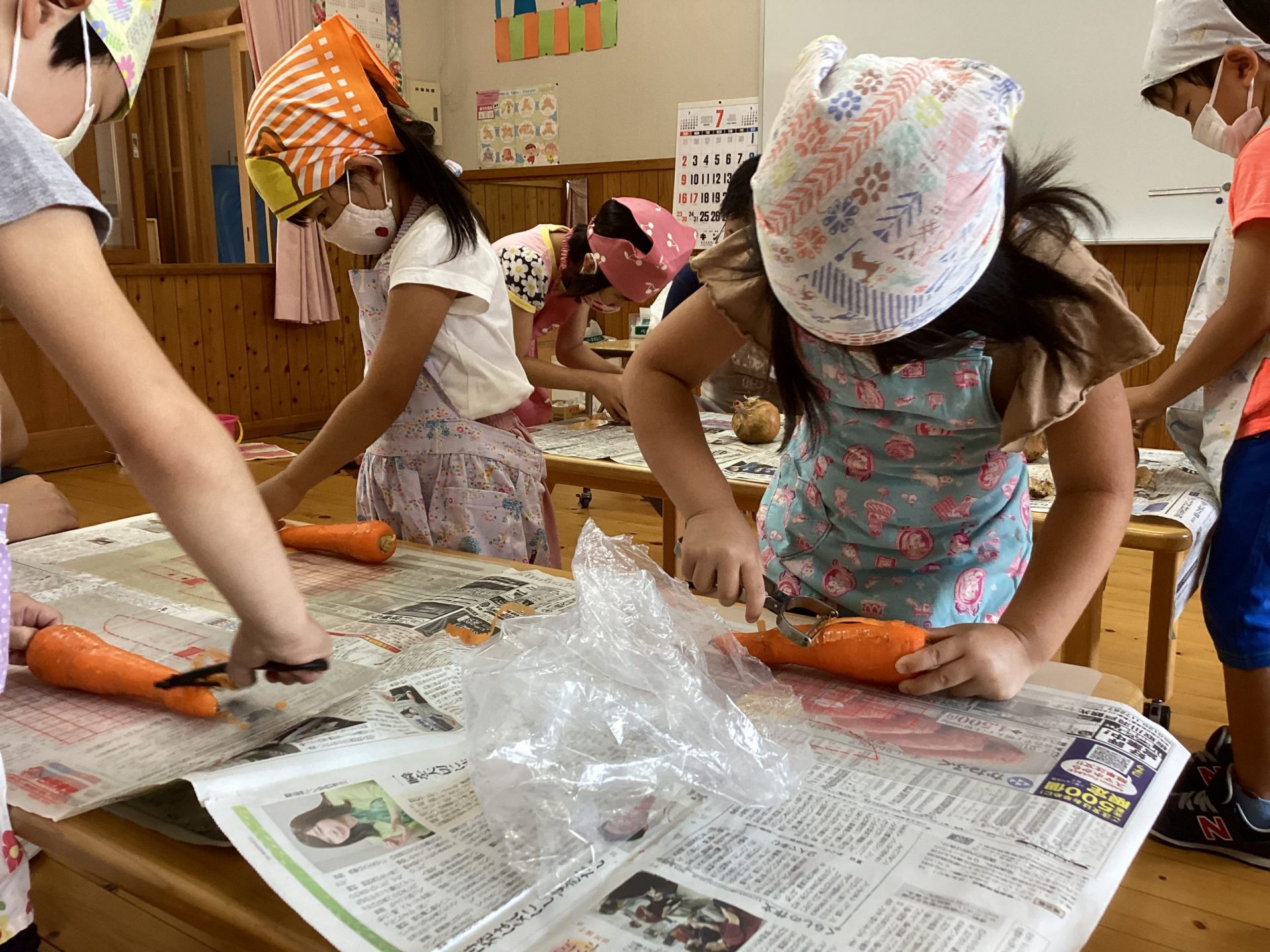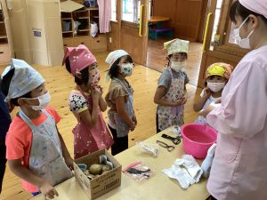 調理ができるように、身支度、手洗いを済ませ、給食室に行き野菜をもらいます。下処理する野菜はじゃがいも、人参、玉ねぎです。保育士から、それぞれの野菜の皮むきの仕方の話を聞きます。