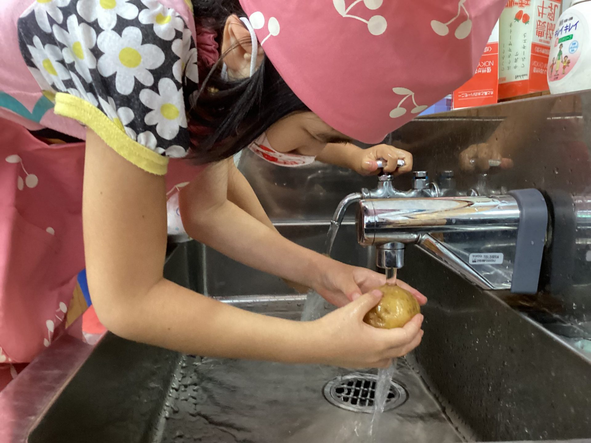 じゃがいもは土がついているので、きれいに洗い落とします。丸みと凸凹があるので、少々難しいです。