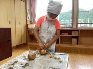 先ずは、玉ねぎです。外側から剥いていきます。手で剥いていくので、安心して作業を進めていきます。