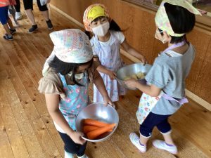 さあ、いよいよ、この日は野菜切です。身支度、手洗いを済ませて、給食室から野菜をもらってきます。