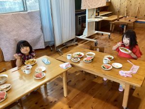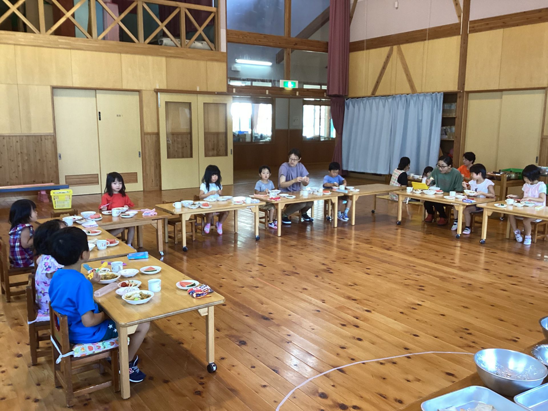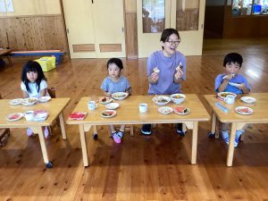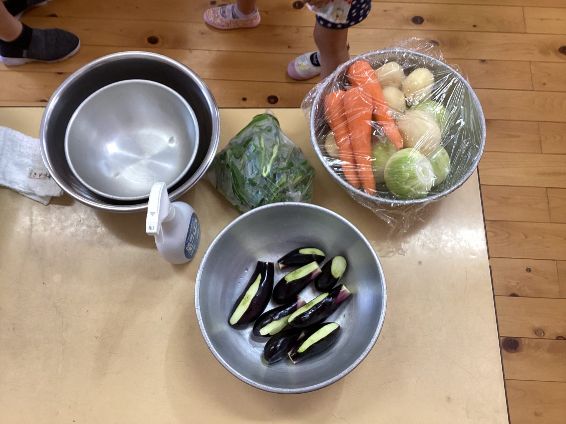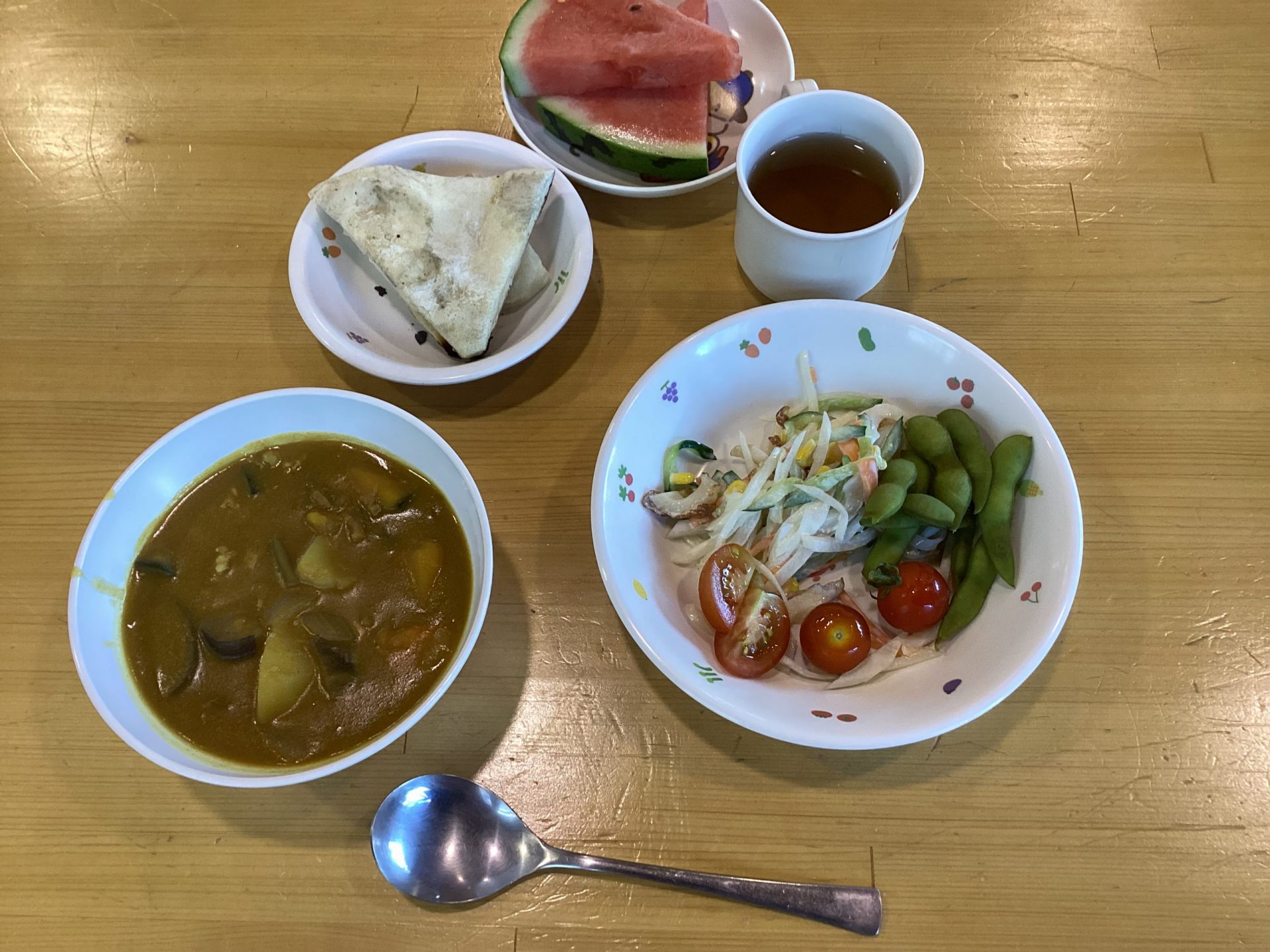 今回の献立は、夏野菜カレーライス、ナン、大根サラダ、ミニトマトと枝豆、すいかです。今回以上児が育てた野菜(じゃがいも、玉ねぎ、人参、ピーマン、なす、ミニトマト、枝豆、大根)と未満児が育てた野菜(きゅうり、スナップエンドウ)が使われました。