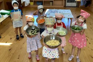 収穫祭のカレー作りはぞう組(5歳児)の担当。子どもたちはぞう組になったら、クッキングが出来ることを、ずっと楽しみにしていました。その待ちに待った日が来て、嬉しくてたまらない様子。