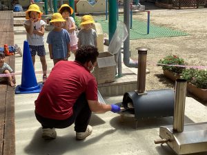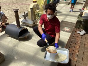 カレーが出来る間、テラスでは園長先生が、ピザ窯でナンを焼いてくれました。