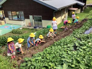 ・快く畑を貸して下さった地主さん、また、開拓し畝を作って下さった地域の方に感謝します。以前の場所より近くなったので、子どもたちも野菜の事を気に掛け、畑活動がしやすくなりました。こうして地域の方に協力してもらいながら、畑の活動ができる事に感謝する大切さを子どもたちに伝えながら、今後の活動も行っていきたいと思います。