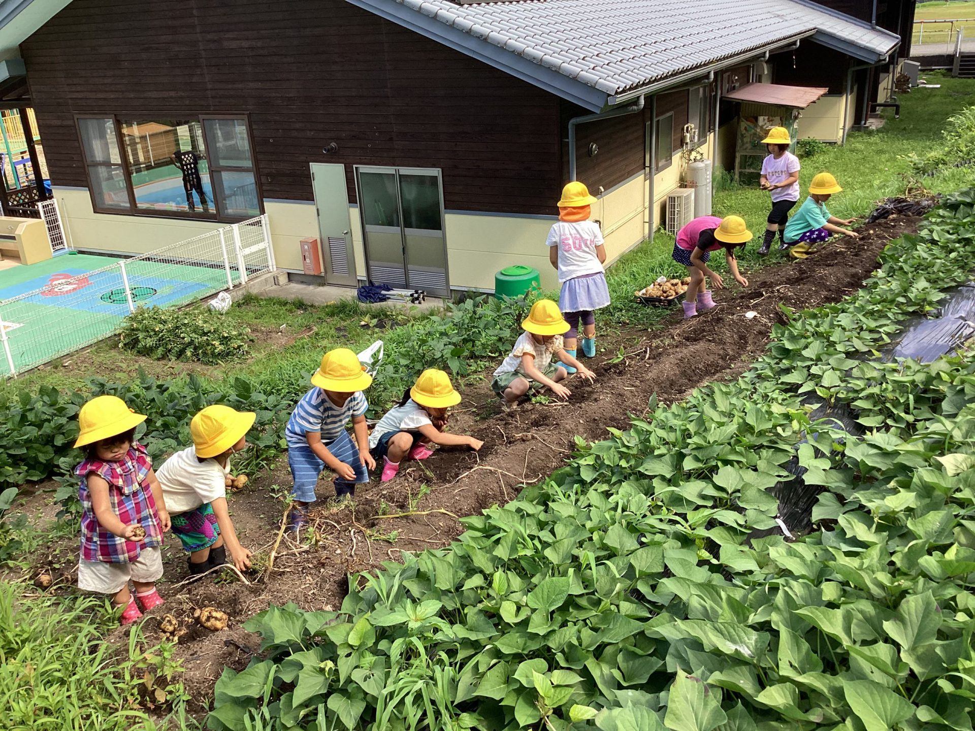 子:「あったー!!」 「見てみて、大きいよ」 「こんなのがあった!」 「小さいのもある」 「ここにもあったー」と、大小様々な大きさ、形のじゃがいもを見つけ、はしゃぐ子どもたち。