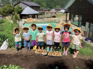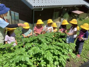 翌日、小さいじゃがいもは保育士が茹で、好みで塩、バター、マヨネーズを付けて食べました。ちょっぴり、特別感で味わいます。残りは給食で出してもらったり、8月の収穫祭で使うようにしました。